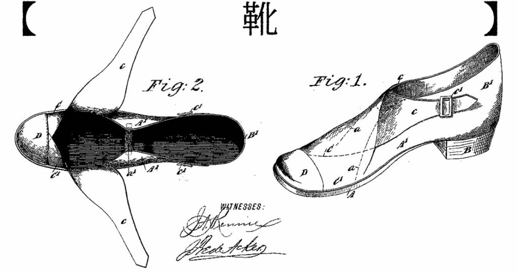 自転車に乗る時や歩行する時に適した靴を提案しているのがこちらの発明。足の甲を覆う部分が左右にパカっと開くので、足入れがしやすく、調節可能なので靴擦れが起こりにくいという。また、炎症性のリウマチにも言及し、その原因として長時間濡れたままの靴下や靴を履いていることを挙げ、そういった問題も解決できるとしている。今でいうコンフォートシューズだが、カチっとした靴しかなかった当時としては斬新だったに違いない。