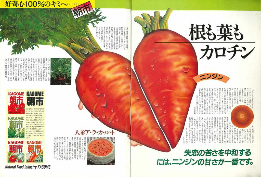 表紙をめくって最初の広告は、前回同様「KAGOME朝市」。ただし、絵柄がレタスからニンジンに。2本並べてハート型というアイデアがいいですね。どうでもいいんですけど、畑で間引いた若いニンジンの葉っぱを天ぷらにして食うと、これがうまいんですよ。