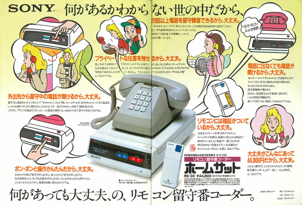 その次にSUZUKIのスクーター4連チャン。とにかくみんな赤。それぞれ続いてSONYの「リモコン留守番コーダー ホームサット」の広告です。コピーは「何があるかわからない世の中だから、何があっても大丈夫、の、リモコン留守番コーダー」。「大丈夫、の、リモコン」の「の、」が効いてますね。