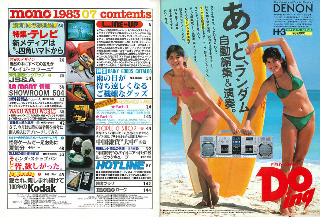 目次です。右のページは、DENONの「Wカセット・フィールドコンポ DOing H-3」の広告です。昔は「デンオン」でしたが、今は「デノン」です。ふたりの素敵なお姉さんは、双子ではなく、どうやら合成写真のようです。当時の合成としては、うまいことやってるんじゃないでしょうか。