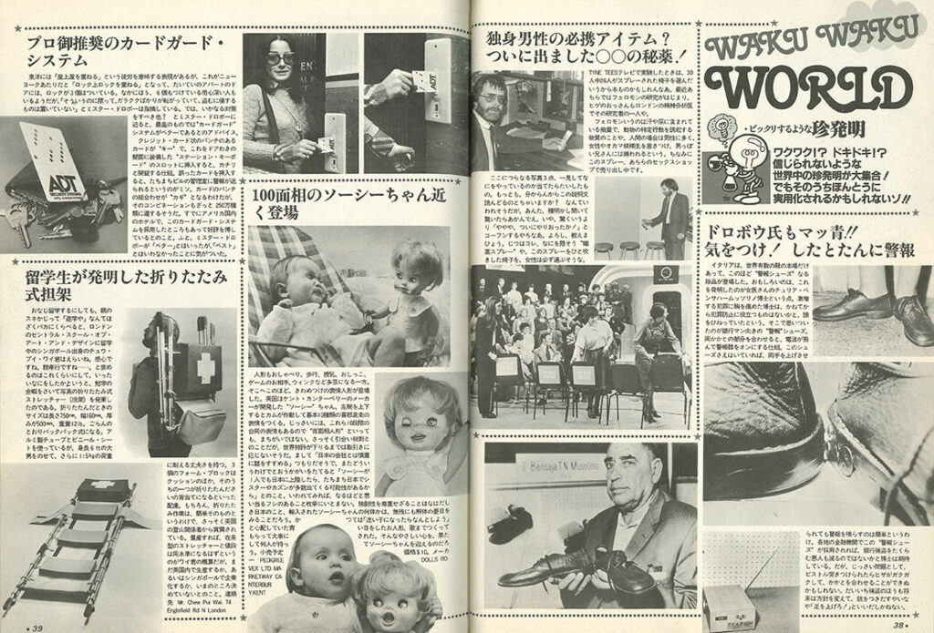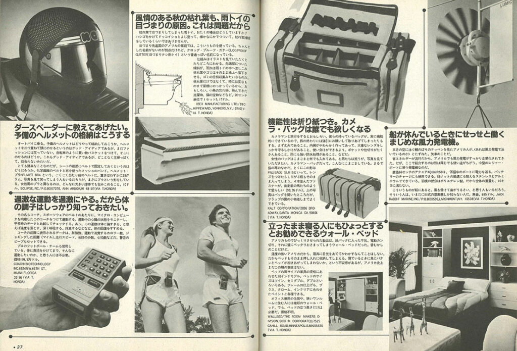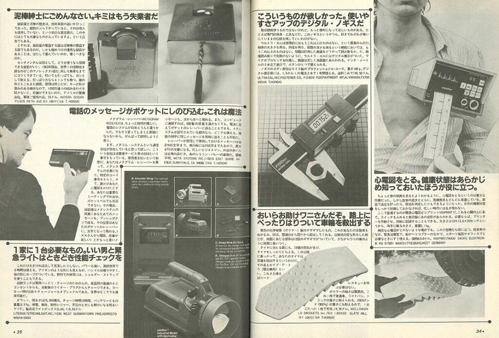 「OVERSEAS NEW-PRODUCTS NEWS」で気になった記事は「電話のメッセージがポケットにしのび込む。これは魔法」。その内容はといいますと、「メタグラム・レシーバーMETAGRAM RECEIVERは、ちょっと説明が難しい。 電話のシステムが日本とうんと違うからだ。でもそう言ってしまうと原稿にならないから、がんばって説明しようと思う。(改行)まず、メタコム・システムという通信会社が存在していると思って欲しい。こういう会社は消費者サービス用の800という番号をもっている。受信者支払いという制度だ。あなたはメタグラム・レシーバーを買って、メタシステムの会員になり、特定のコード番号をもらう。さて、誰かがあなたに電話をかけたとする。あなたは重要なミーティングで外出中、ポケットベルでも反応できない。その場合、 送話者はメタシステムの係員にあなたあてのメッセージを、プッシュボタンで送る。その伝言はあなたのポケットのレシーバーに、文字となって現れる。〈××さんから電話、返事が欲しい〉とかもっと長いメッセージも、次から次へと現れる。また、コンピュータに連絡すれば、800番の係員を通さなくても、電波に変えてポケットのレシーバーに送ることもできる。メタシステムが認可されている都市なら、どこでも使える。複数の相手に同じメッセージを同時に送ることも可能だ。(改行)レシーバーが受信して保持しておけるメッセージは合計940文字まで。表示板には20文字まで入るので、最大 47行の文章になる。忙しいビジネスマン、外出の多い人は必携の品だネ。あのシリコン・バレーの産物だ。価格不明」とのこと。スマホもメールもなかった時代の魔法のような超スグレモノのお話でした。
