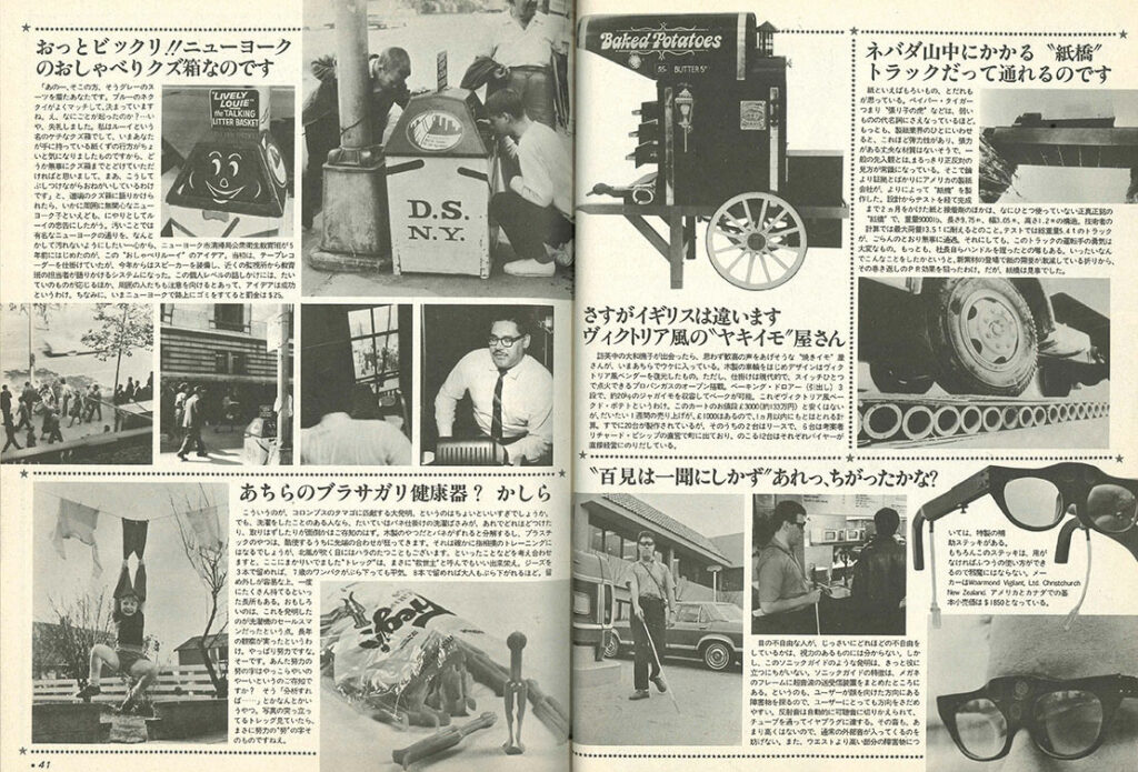 「WAKU WAKU WORLD ビックリするような珍発明」からは、「ネバダ山中にかかる “紙橋”、トラックだって通れるのです」をピックアップ。「紙といえばもろいもの、とだれもが思っている。ペイパー・タイガーつまり “張り子の虎” などは、弱いものの代名詞にさえなっているほど。もっとも、製紙業界のひとにいわせると、これほど弾力性があり、張力がある丈夫な材質はないそうで、一般の先入観とは、まるっきり正反対の見方が常識になっている。そこで論より証拠とばかりにアメリカの製紙会社が、よりによって “紙橋” を製作した。設計からテストを経て完成まで2ヵ月をかけた紙と接着剤のほかは、なにひとつ使っていない正真正銘の “紙橋” で、重量9000lb(=4082.331kg)、長さ9.75m、幅3.05m、高さ1.2mの構造。技術者の計算では最大荷量13.5tに耐えるとのこと。テストでは総重量5.4tのトラックが、ごらんのとおり無事に通過。それにしても、このトラックの運転手の勇気は大変なもの。もっとも、社長自らハンドルを握ったとの噂もある。いったいなんでこんなことをしたかというと、新素材の登場で紙の需要が激減している折りから、その巻き返しのPR効果を狙ったわけ。だが、紙橋は見事でした」という、わかるような、わかんないようなPRの話でした。