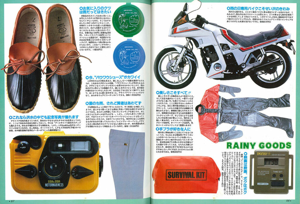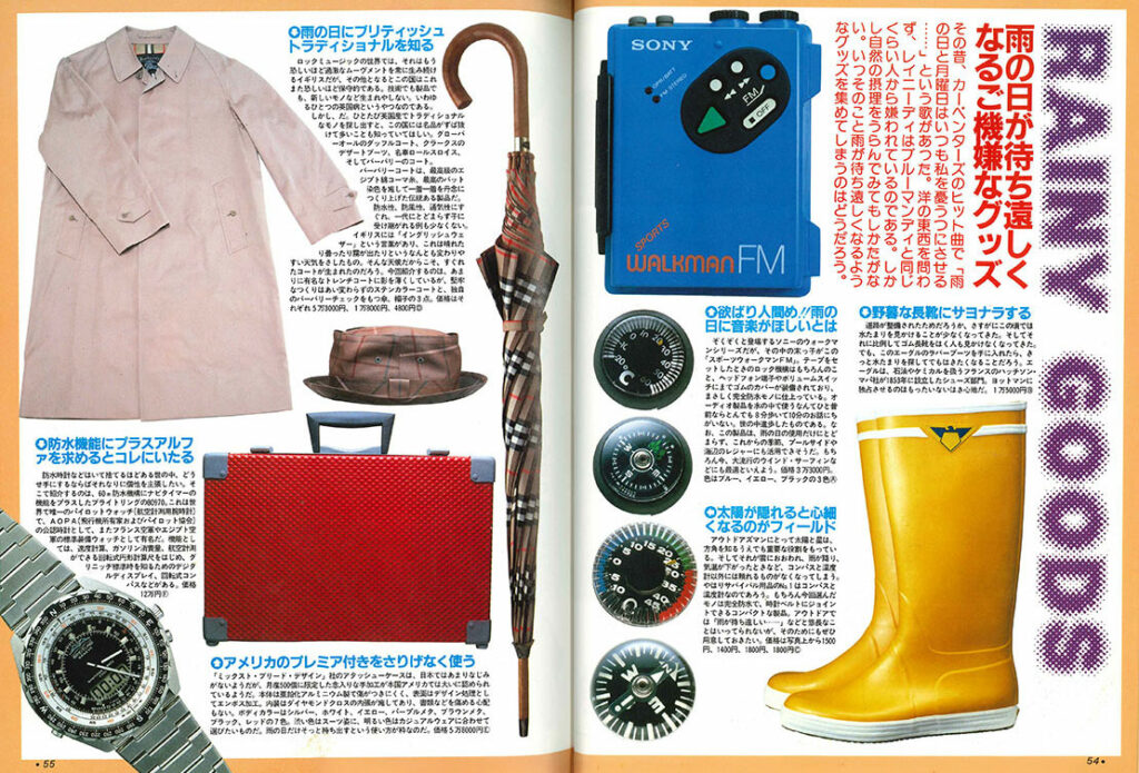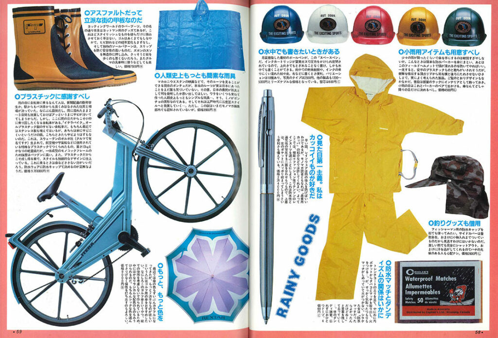 でもって、9ページでお送りするのが、特集「RAINY GOODS」。サブタイトルは「雨の日が待ち遠しくなるご機嫌なグッズ」です。いわゆる雨具だけじゃなく、防水系のアイテムが一緒に並んでて、サブタイトル通りのラインナップになってます。