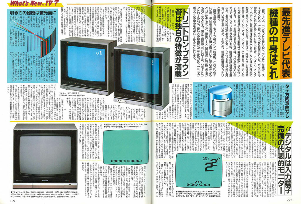 その次が、創刊1周年記念特別企画と銘打った「特集・テレビ」。まずカラー14ページで「新メディアはあの四角いマドから」。そして、モノクロ11ページで「過去〜未来/テレビ今昔物語」の計25ページ。当時のモノ・マガジンとしてはかなりのボリュームで、その力の入れようがわかります。
