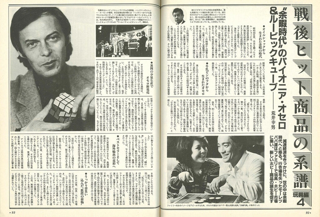 「戦後ヒット商品の系譜 玩具編4」。クローズアップするのは「オセロ」と「ルービックキューブ」。大見出しは「“余暇時代” のパイオニア・オセロ&ルービックキューブ」、リードは「減速経済をきっかけに、世の中は余暇時代へと移る。行き場を失ったモーレツパパ達はファミリーで玩具・ホビー市場に集い、新しいホビー商品の誕生を促す」。この頃は「余暇、余暇」ってよく言われたましたけど、最近はあまり使ってないですかね?