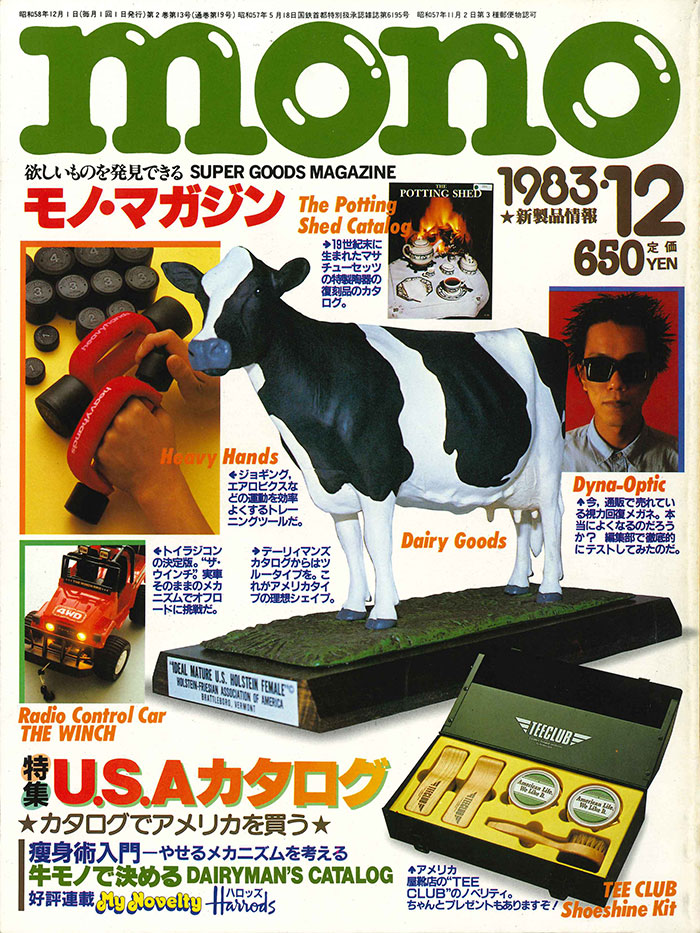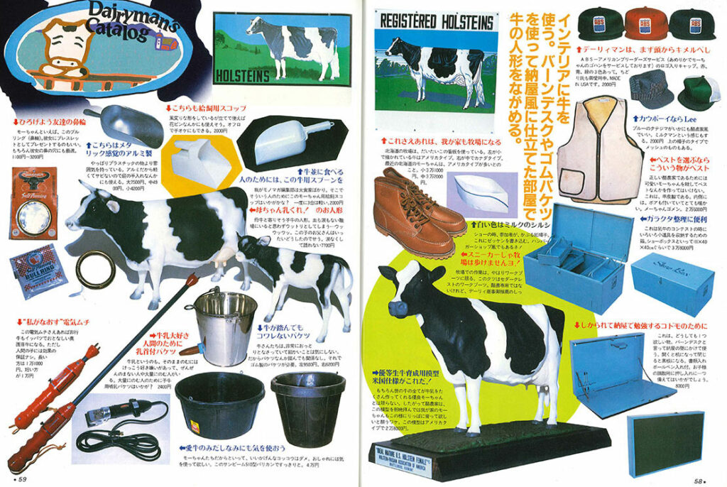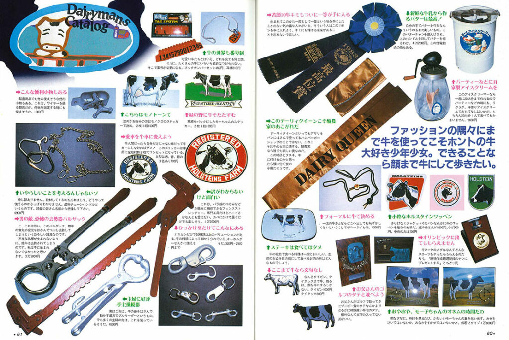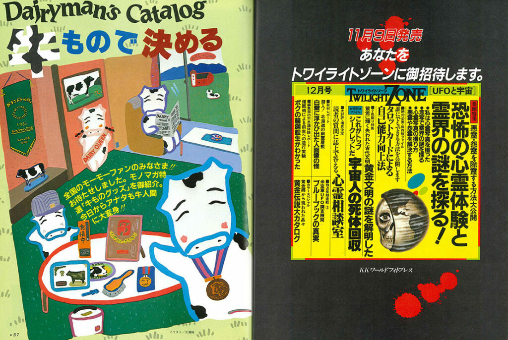 そして、カラー6ページ構成の「Dairyman’s Catalog 牛もので決める!」。最初の右ページが気になる「トワイライトゾーン」の自社広なんですが、前回も紹介してるので、今回は無視。で、リードは「全国のモーモーファンのみなさま!! お待たせしました。モノマガ特選『牛ものグッズ』を御紹介。今日からアナタも牛人間に大変身!!」。面白いんですけど、間違いなく誰も待っていなかったと思います。トビラのイラストはというと、おお、現在『モノ・マガジン』でいちばん長く連載を続けていただいている、みうらじゅん先生じゃないですか。クレジットは「三浦純」と漢字表記になってます。牛がらみのグッズがわんさか紹介されてるんですが、ひょっとしてこれは、みうら先生の持ち込み企画?