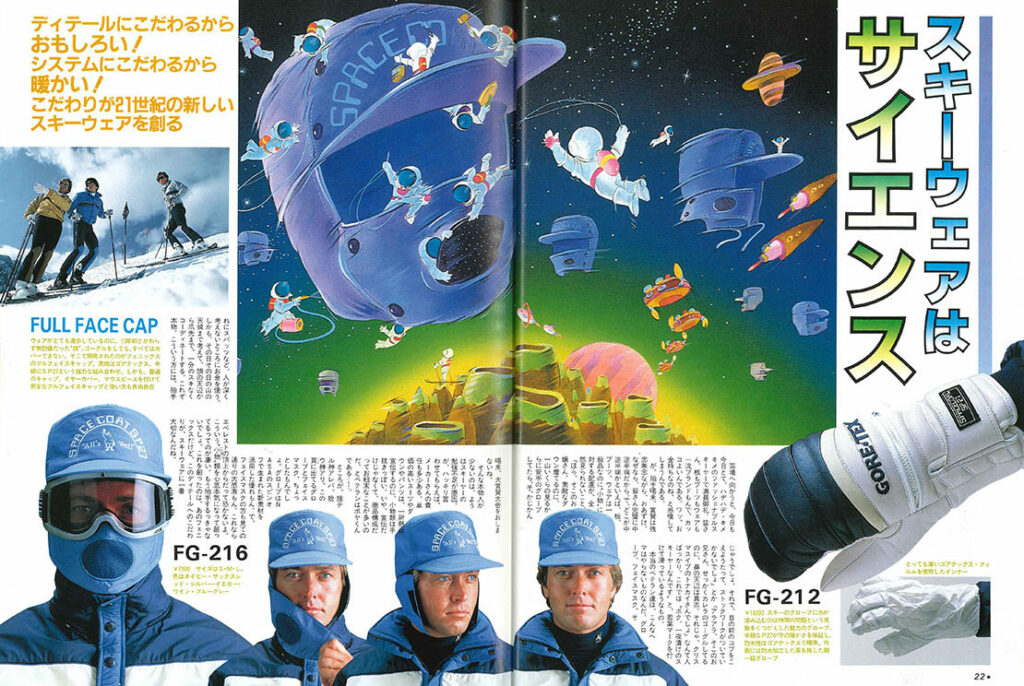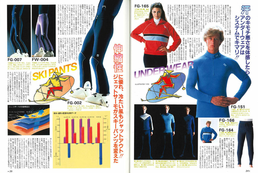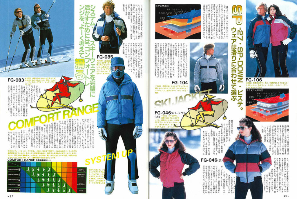 カラー12ページ構成の「スキーウェアはサイエンス」。「苗場へ向かうと、今日も今日とて、ハデハデ・キメキメのファッショナブルスキーヤーで満員御礼。皆さん、板もブーツもウェアも一流ブランドもんで、カッコよいんである。ワッ、お金持ちなのね、と感嘆してしまうんである。(改行)が、拍手喝采、賞賛は残念無念ながら、おあずけ。なぜなら、皆さん完璧に中途半端だから。で、どこが中途半端かといえば、板、ブーツ、ウェアは一級品なのに “小物” に対する配慮が、全然見られないこと。『ほら、そこのお嬢さん。素敵なダウン着てるのに、 一山いくらの見るからに安手のグローブしてたら、手、かじかんじゃうでしょ。それで、目の前のコブをこえようたって、ストックワークがついていかないでしょ』とか『アラアラ、そこのお兄さん、せっかくカレラのゴーグルしてるのに、鼻の天辺は真赤。それじゃ、クリスマスイブのトナカイさんでしょ』なんて人ばっかり。これでは “ボク、一夜漬けのスキーヤーなんです” と、若葉マークを付けて滑っているようなもの。本当のベテラン達は、こんなへマはやらないものなんだ。グローブ、フェイスマスク、それにスパッツなど、人が深く考えないところにお金を使う。しかも、その日その日の山の天候まで考えて、頭の天辺から爪先まで、一分のスキなくコーディネートする。これぞ本物。こういう方には、拍手喝采、大賞賛大会をおしまないね。(改行)そんな本物人が少ないのは、ようはスキーヤーの勉強不足が原因。が、ハッキリ言わせてもらえば、メーカーさんの責任も多少。単価の高いスーツやダウンやパンツは、一所懸命宣伝するのに、小物類は手抜きっぽい。いや、宣伝だけじゃなくて、商品構成だってお粗末なことが多いのだ、とベテランはボヤくんである・・・・・。」というボヤキから始まって、当時の最新スキーウェアを紹介してます。