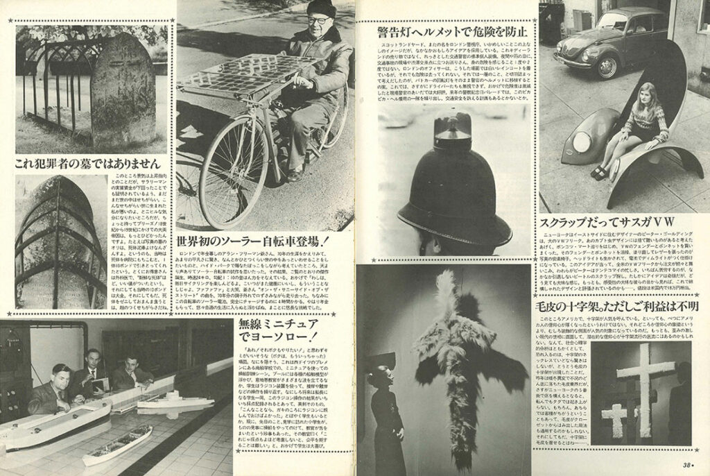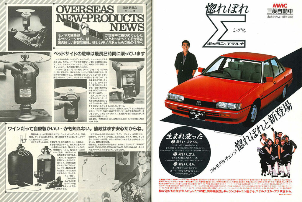 「OVERSEAS NEW-PRODUCTS NEWS」なんですが、その前に最初の右ページの広告を見てみましょう。三菱自動車の「Σ(シグマ)」です。注目したいのは、爽やかな笑顔の高倉健さん、ではなくてクルマの色。そう、やっぱり真っ赤なんです。