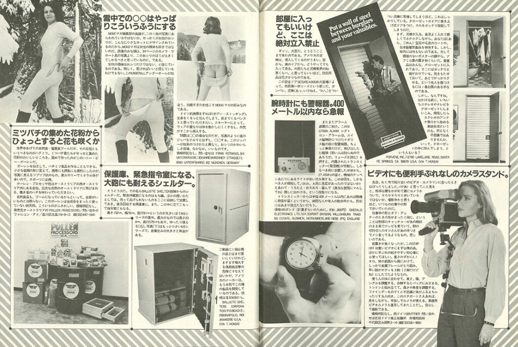 で、今回、目をつけた記事は「雪中での○○はやっぱりこういうふうにする」です。「MONOマガ編集部の良識が、この1枚の写真にあらわれているではないか。せっかくの女性のおシリが、こんなに小さなカットにデザインされているのだから、MONOマガは女性の裸体を好きではないのだ。読者のみな様は、34ページのカメラ・サポート具の写真より、このおシリのほうが大きくてしかるべきと思っているのに、である。(改行)女性の価値はおシリだけではない、と信じているのである。同じく、若ければいいと信じているわけでもない。このUNDERALLアンダーオールが似合う、30歳すぎの女性こそMONOマガの好みなのである。(改行)ドイツ的表現をすれば〈ボディ・ストッキング〉。全身をくるっと包んでしまう、首までくるパンストと思っていただきたい。スキーヤーにとって、ウェアの重なりは体を動かしにくくするし、外気がそこから侵入する。(改行)問題は○○の場合なのだが、写真のように後のジッパをクルリとはずし、○○する。このジッパ一が従来のつけかたと異なり、おシリのかわいらしさ倍増。なかなか、いいものです。」。好みの話はともかくとして、面白い製品なんでピックアップしました。