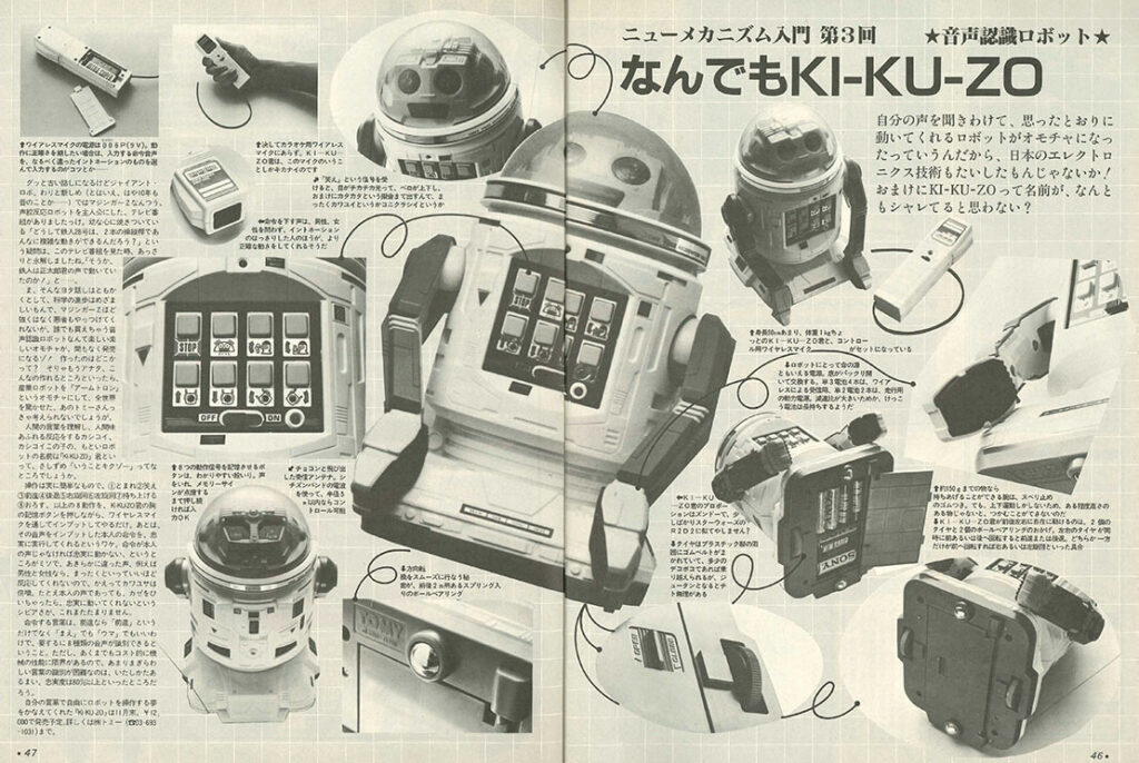 モノクロ2ページの「ニューメカニズム入門 第3回 ★音声認識ロボット★ なんでもKI-KU-ZO」。コントロール用ワイヤレスマイクを通じて、「とまれ」「笑え」「前進」「後退」「右旋回」「左旋回」「持ち上げる」「おろす」の8つの動作が可能なんだとか。R2-D2にそっくりだし、ちょっと欲しいです。