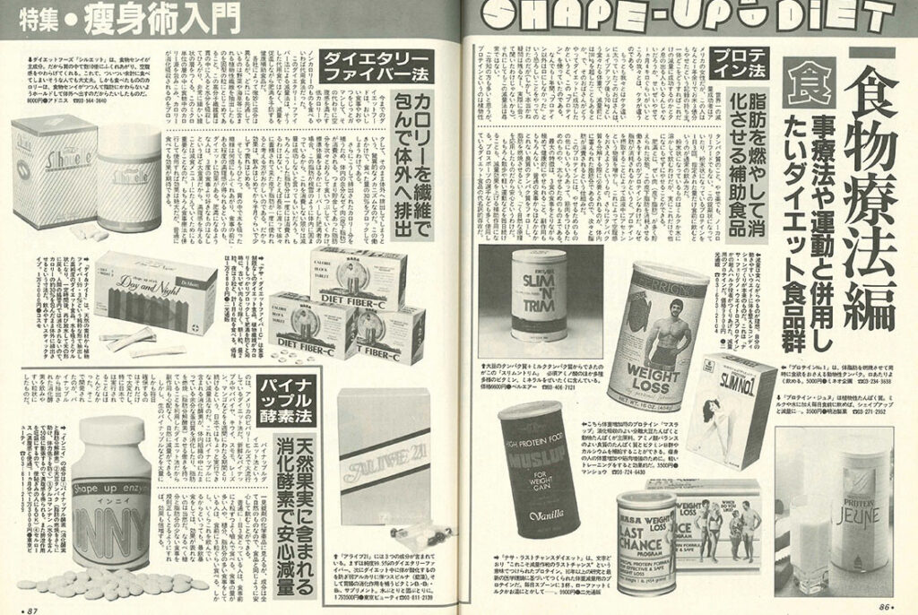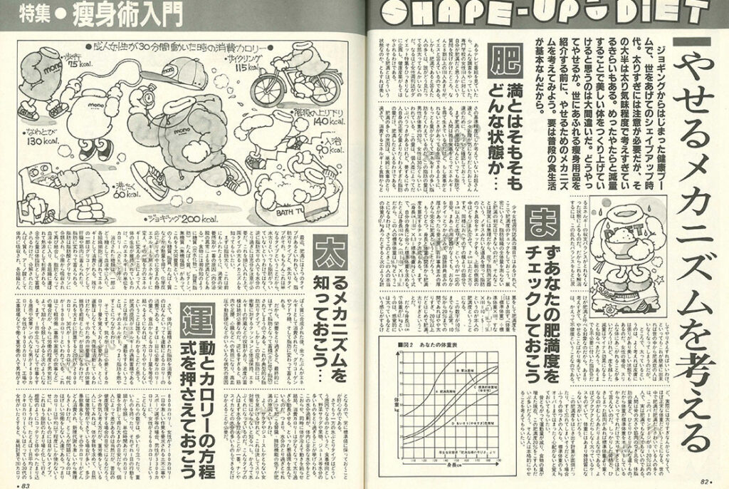 モノクロ13ページの特集「痩身術入門」。「世の中シェイプアッププームは尽きないようで、あまり肥満とはいえないお嬢さんまで汗を流して体重調整に余念がないご様子。もっとも、シェイプアップとはもともと身体のバランスを調整してやること。太りすぎでもやせすぎでもない、ベストコンデションに体を保つためのものなんだから、健康生活大いに結構なことである。考えてみれば、単にやせたいと言っても、要は標準的な体格に戻してやるわけで、こんなものは食事と運動のバランスさえくずさなければ、いつも整っているはずである。「だから痩身術とはいってもただやせることではなく、しいていえば整体術のことなのだ。」ということで、あくまでも健康的に痩せるというのがダイエットの本質っていうのは、昔も今も変わらずです。