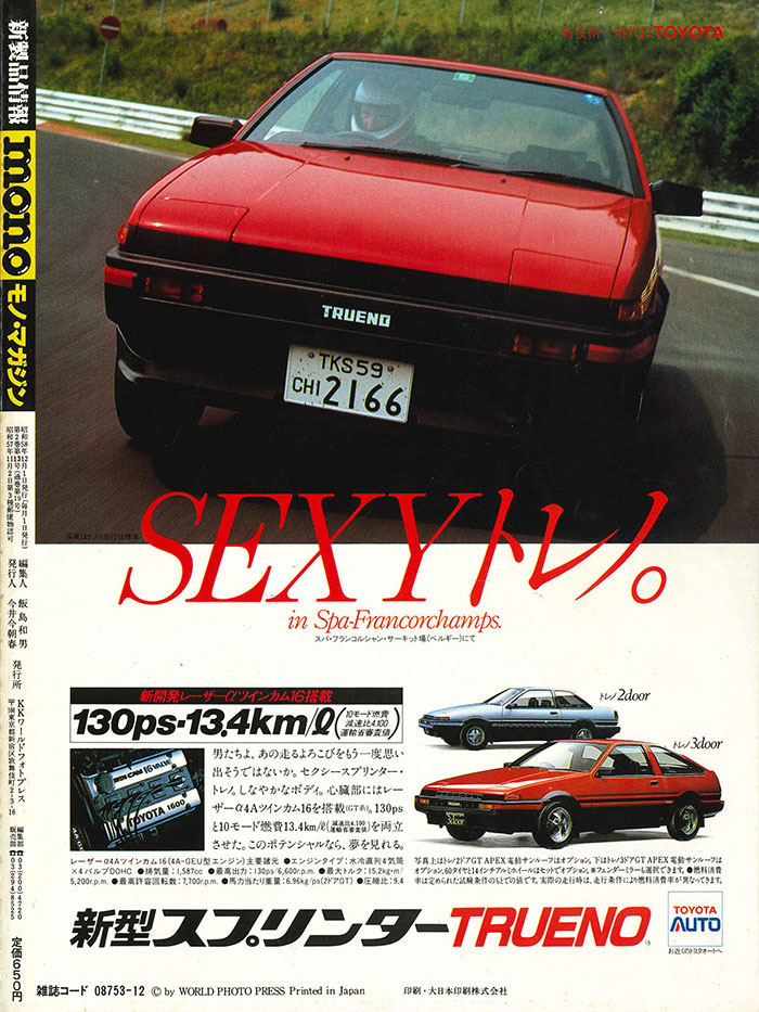 最後は表4広告です。トヨタの「新型スプリンターTRUENO(トレノ)」ですね。このクルマもスペースシップ風味がちょっと利いてて、カッコいい。ところで、覚えてらっしゃいますか、このクルマも真っ赤です。4台目です。よっぽど赤いクルマが好きな方ばっかりの時代だったんじゃないかと思うんですが、どうなんでしょうか。ちなみに、百恵ちゃんが「真赤な〜」と歌って大ヒットしたのは1978年のことでした。