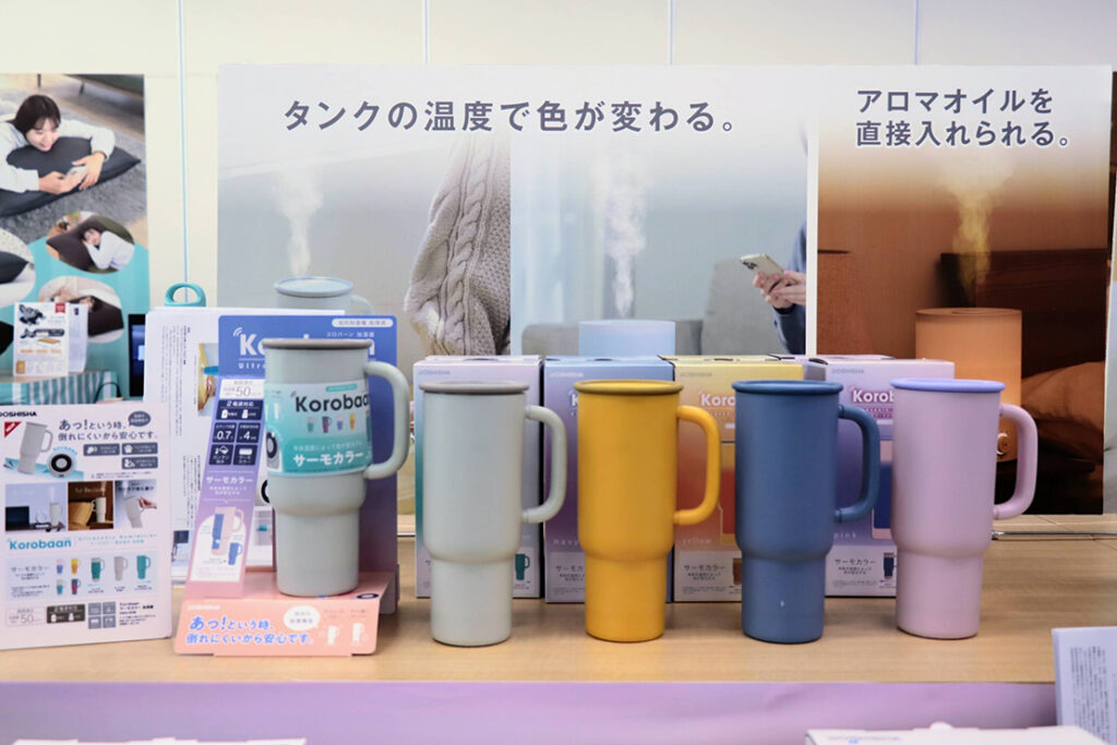 Korobaanサーモカラー加湿器。この加湿器の特徴は、①サーモクロミックの技術で冷たい水を入れると本体色が変わる。②従来の加湿器には珍しい、個性的な形とカラーリング。③独自の吸盤構造で横からの力に強いから倒れにくい。加湿器とは思えないコンパクトでカラフルな本体は置く場所を選ばない仕様だ。