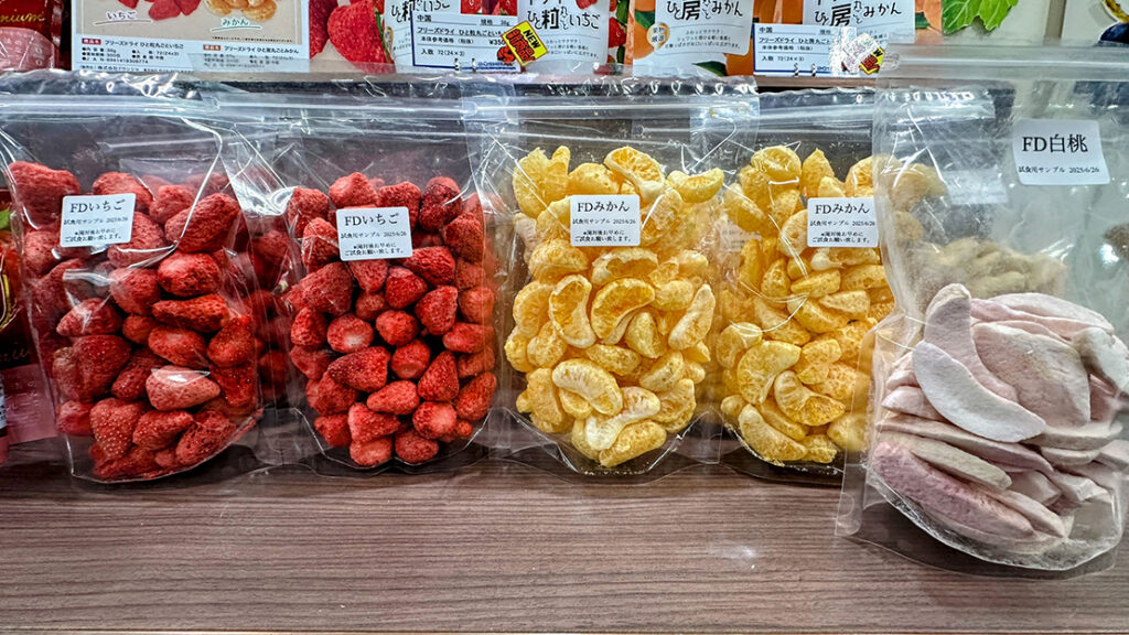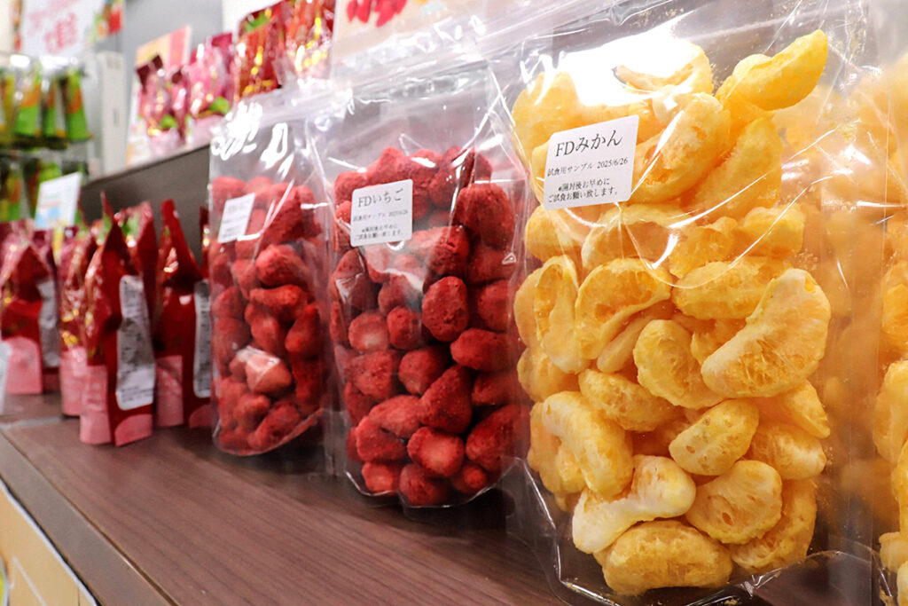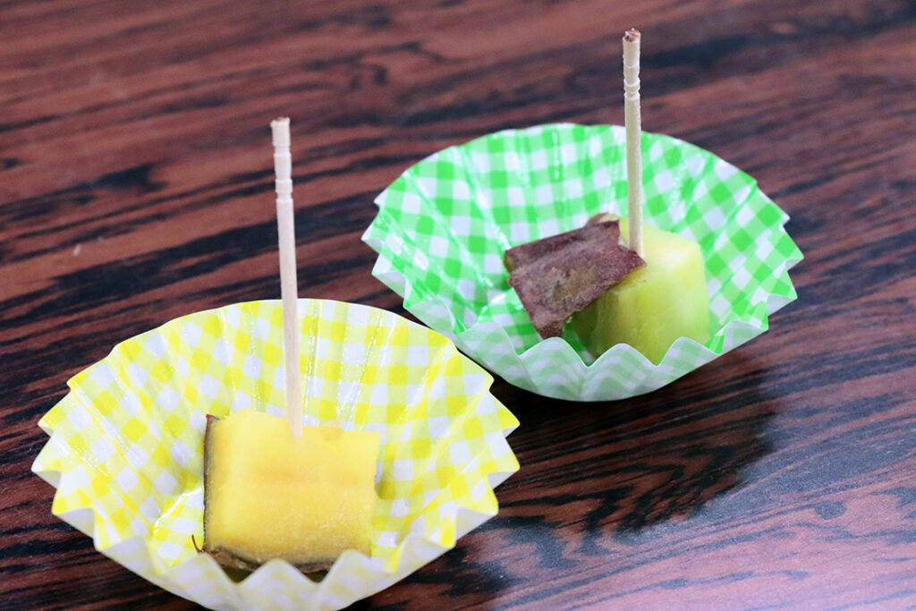 試食品の焼き芋は、二度焼(黄色紙皿)冷やし(緑紙皿)どちらともさつまいも本来の甘さが楽しめる一品だった。