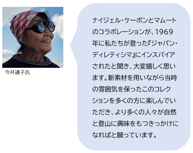ナイジェル・ケーボン氏はミリタリーウェア、アウトドアウェアの世界的コレクターとして知られるデザイナー。ヴィンテージコレクションから得るインスピレーションと、トラディショナルな素材にこだわったカジュアルウェアには根強いファンが多い。今回のナイジェル氏とマムートとのコレクションのベースにあるのは、1969年に女性として初めてアイガーの北壁登攀に成功した登山家 今井通子氏へのオマージュだ。