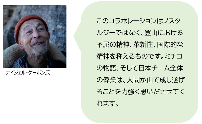 今井通子氏は、ヨーロッパで女性が働くのに夫の許可が必要だった時代に6人の日本登山チームの一員として、また医師として遠征隊に参加。「ジャパン・ディレティシマ」と呼ばれる直登ルート開拓の一翼を担ったひとりとして歴史に名を残し、今も時代の先駆者として登山家たち、そして女性たちの尊敬の念を集めている。