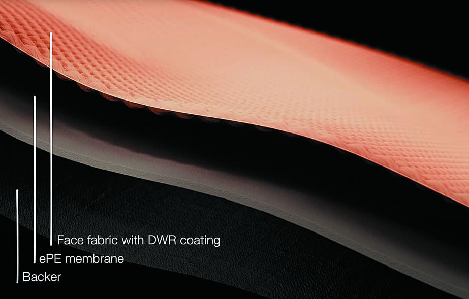 非フッ素系の環境配慮型メンブレンに、フッ素を使わずにDWR加工を施したリサイクルナイロンの表地、強度に優れたGORE®Micro Grid Backerの組み合わで優れた耐候性と耐久性を実現。