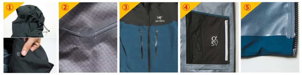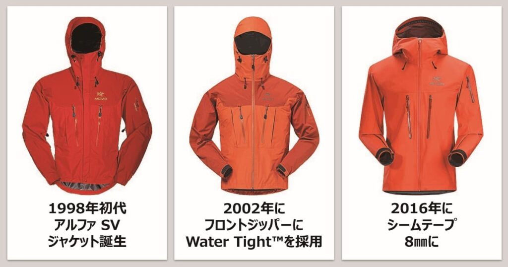 1998年、YKKとの共同開発によるジッパーをポケットに採用し、ポケットのフラップを排除した初代アルファ SV ジャケットが誕生。2002年にはWaterTight™ジッパーをフロントに採用し、フラップを無くしたデザインが実現。大幅刷新した2016年モデルは、素材とロックパーツ、ファスナーガレージが不要となるRS™ジッパーを導入、シームテープの幅を8㎜に。パフォーマンス向上のための課題が発生するたびにアップデートされている。