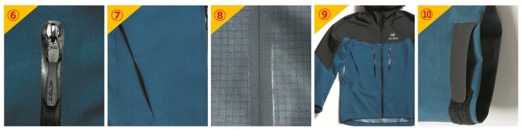 ⑥ 2016年から採用しているYKKと共同開発した止水ジッパー。いまや定番の止水ジッパーのパイオニアなのだ。ポ ケットのフラップの省略で軽量化も実現し、デザインの可能性も広げていった。
