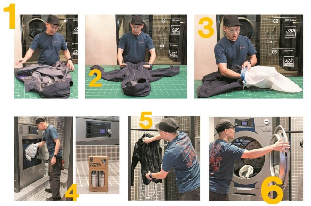 乾いたシェルジャケットを15分前後乾燥機で熱入れする。ゴアテックス素材の表面にこの熱入れを行うことで撥水機能が驚くほど蘇る。洗濯後、水を垂らしてはじき具合で効果を体感しよう。