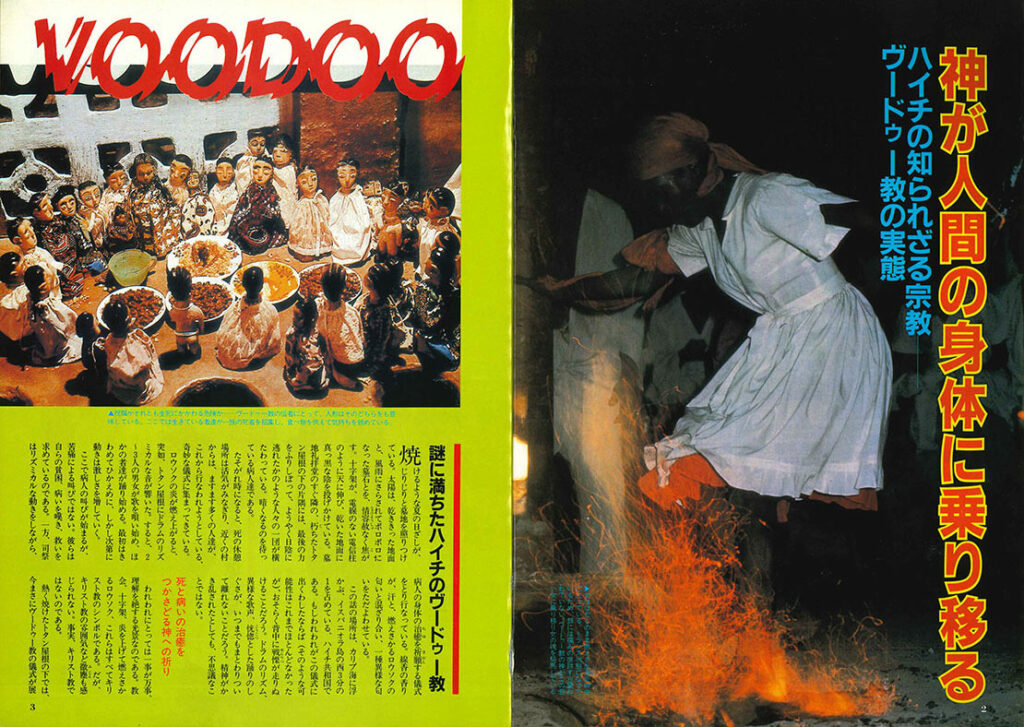 まずは「神が人間の身体に乗り移る ハイチの知られざる宗教ヴードゥー教の実態」。右ページの写真のキャプションは「女ははだしのまま燃えさかる炎の中に立っている。トランス状態になっているため、顔には痛みに痕跡すら現れていない。ヴードゥー教の神がこの若い女に乗り移り女の魂を騎馬している」。左ページの写真は「祝福かそれとも生死にかかわる危険か——ヴードゥー教の信者にとって、人形はそのどちらをも意味している。ここでは生きている者達が一族の死者を召集し、食べ物を備えて気持ちを鎮めている。」。