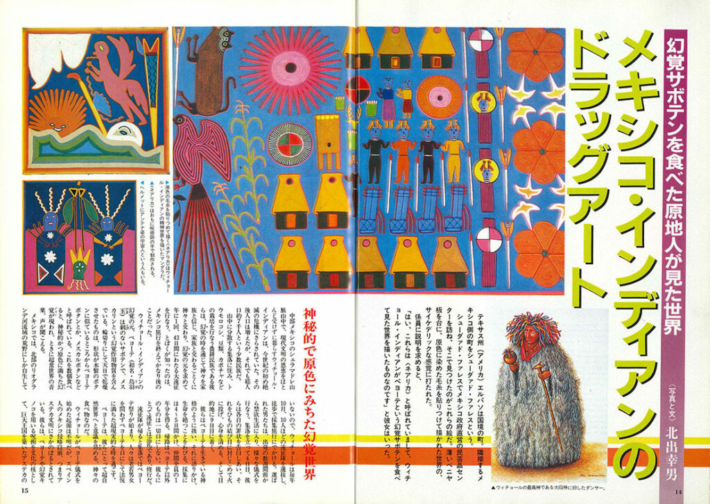 「幻覚サボテンを食べた現地人が見た世界 メキシコ・インディアンのドラッグアート」はカラー4ページ構成。幻覚サボテンというのはペヨーテのことで、和名は鳥羽玉(うばたま)。アメリカ・インディアンを中心に治療薬として使用されてるようですが、日本では麻薬に指定されてますから、当然使っちゃダメですよ。