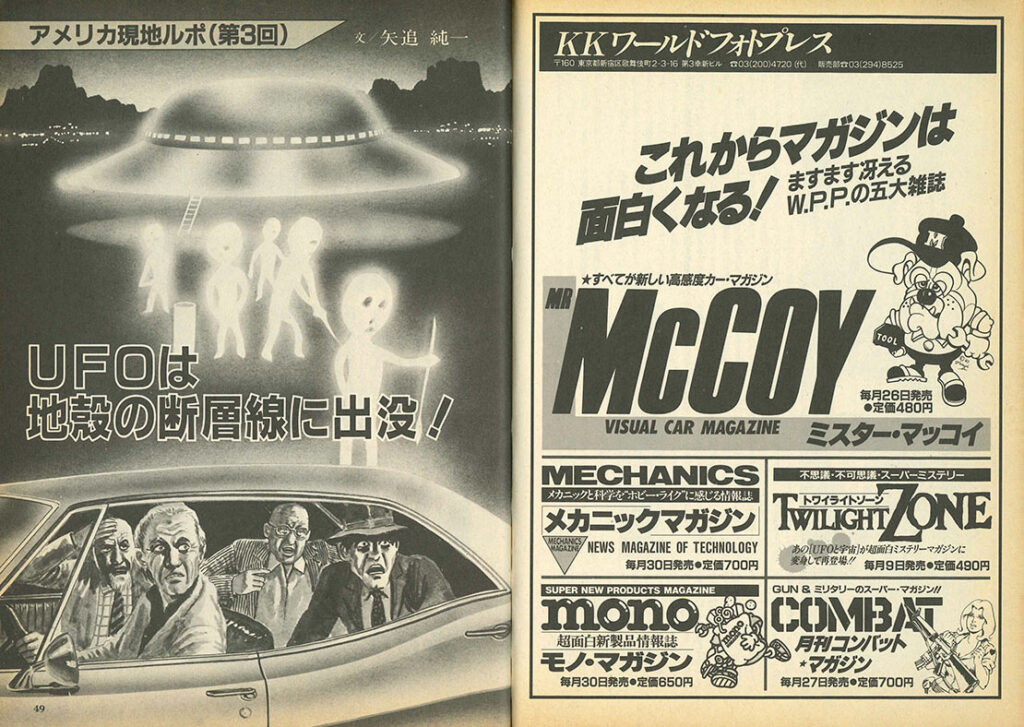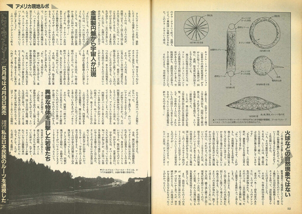 「アメリカ現地ルポ(第3回) UFOは地殻の断層線に出没!」はモノクロ6ページ。この分野では大御所、あの矢追純一さんが原稿を書かれてます。なんで、リードだけでも紹介しときます。「地殻の断層地帯では、なぜUFO事件が多発するのか? ヘリでパトロール中の警官がUFOと遭遇した事件を取材するため、米南東部のノースカロライナ州に出向いた筆者は、その地域一帯で奇怪なUFO事件が続々と起こっていることを知った。地殻の断層線の近くに住んでいて、自ら何度も怪光現象を目撃したという地元のUFO研究家は、幻覚や自然現象ではないと断言して、それを証明するデータを筆者の目の前に次々と提出したのだ。」。