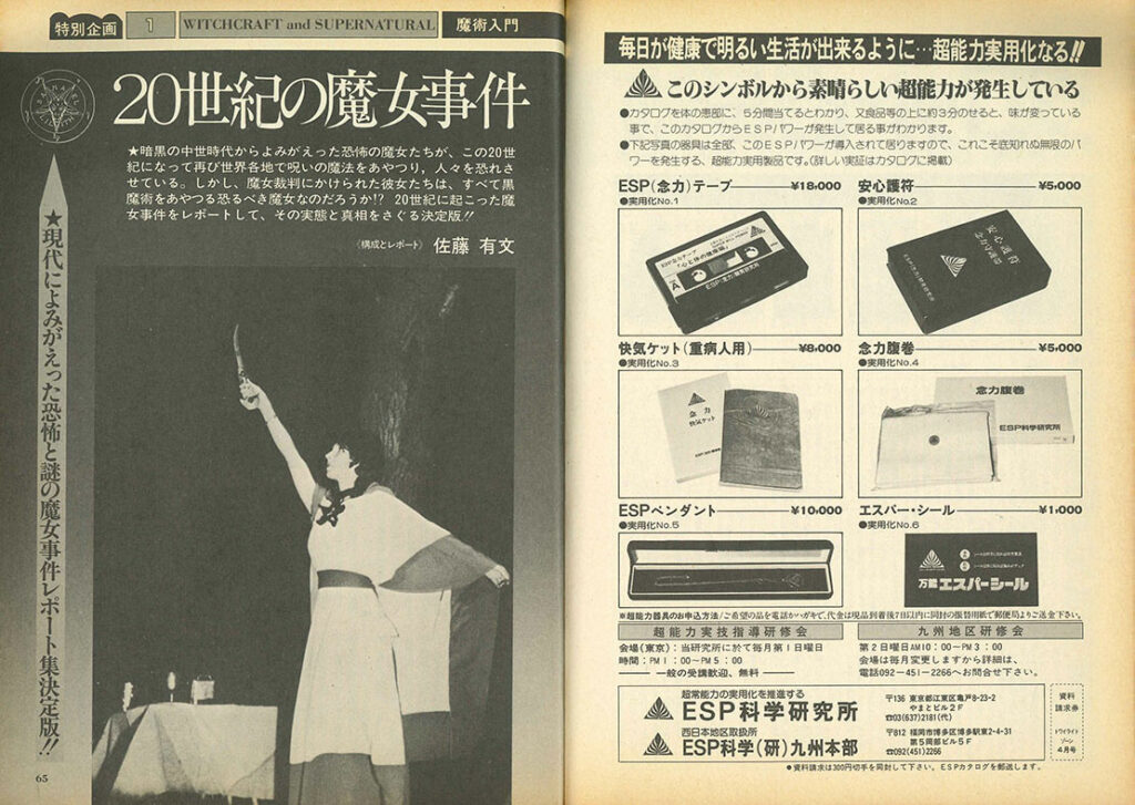 表紙を捲るとドーンと目に飛び込んでくるのが、付録の「魔女バベッタのデザインによる魔法ステッカー」。「アメリカ最高の魔女バベッタは、来日を記念して本誌愛読者のために、白魔術の魔法円を特別にあみだしてくれました。この魔法円は、大宇宙と大自然のパワーを利用して第3の霊眼をひらく驚異的なものです。4月13日夜8時より放送の、フジTV『金曜ファミリー・ワイド “これが世界の心霊だ!”」の中で、魔女バベッタがこのステッカーを利用して魔力をテレパシーで送りますので、大切に保存しておいてください。」とのこと。テレビとの連動企画だったんですね。当時、いかに話題を呼んでいたのかがうかえます。