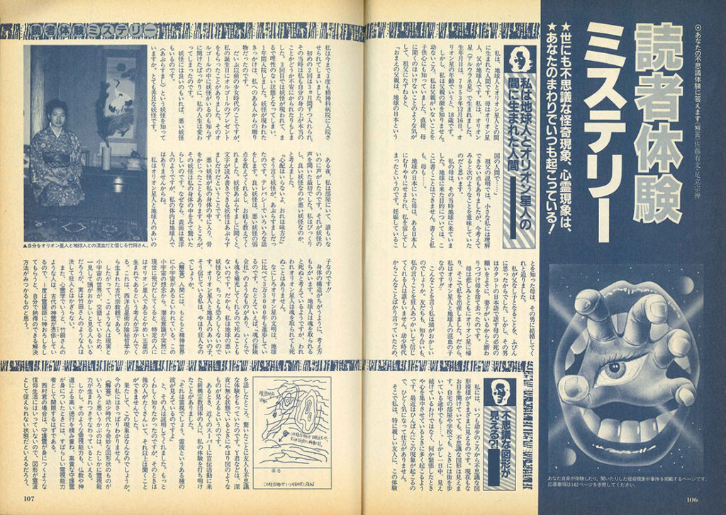 特色1色で6ページの投稿企画「読者体験ミステリー」。読者が体験した世にも不思議な怪奇現象、心霊現象などを紹介してます。なんだかすごい内容なんだよな、ということで、これも見出しだけ並べときます。