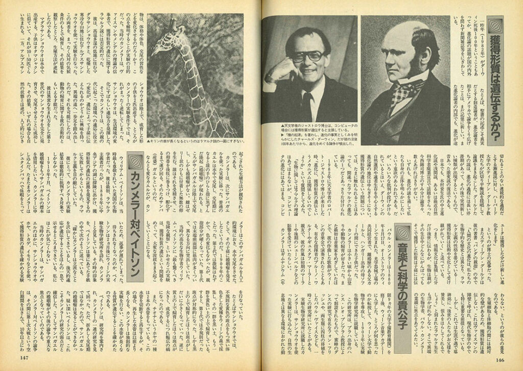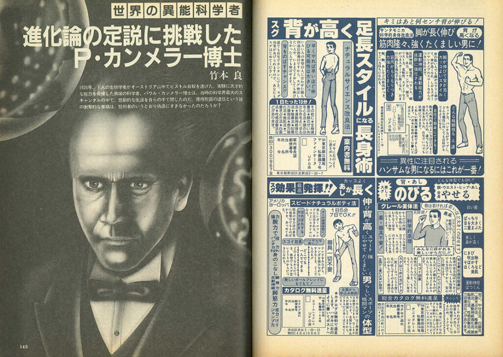 「世界の異能科学者 進化論の定説に挑戦したP・カンメラー博士」はモノクロ5ページ。こちらの原稿は、高明なUFO研究家の竹本良さんです。せっかくなので、リードを引っ張っときます。「1926年、1人の生物学者がオーストリア山中でピストル自殺を遂げた。実験に天才的な能力を発揮した異端の科学者、パウル・カンメラー博士は、当時の科学界最大のスキャンダルの中で、悲劇的な生涯を自らの手で閉じたのだ。獲得形質の遺伝という彼の衝撃的な業績は、批判者のいうとおり偽造にすぎなかったのだろうか?」。