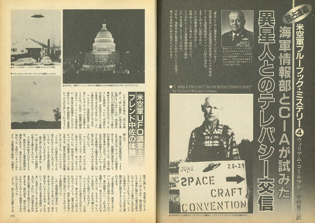 そして「独占連載 米軍ブルーブック・ミステリー④ 海軍情報部とCIAが試みた異星人とのテレパシー交信」は、モノクロ6ページ。「“君はUFOに偏見をもっていないか?” 米空軍公式UFO調査機関の責任者フレンド中佐はCIAと海軍情報部のメンバーに呼び出されまずこのように質問された。UFO目撃者は頭がおかしい。当時はこうした考えが一般的だった。ところがCIAと海軍情報部の人間がUFOを目撃してしまったのだ。それも、海軍中佐が異星人とのテレパシー交信で彼らの目の前に呼び寄せたUFOを!」というレポートです。