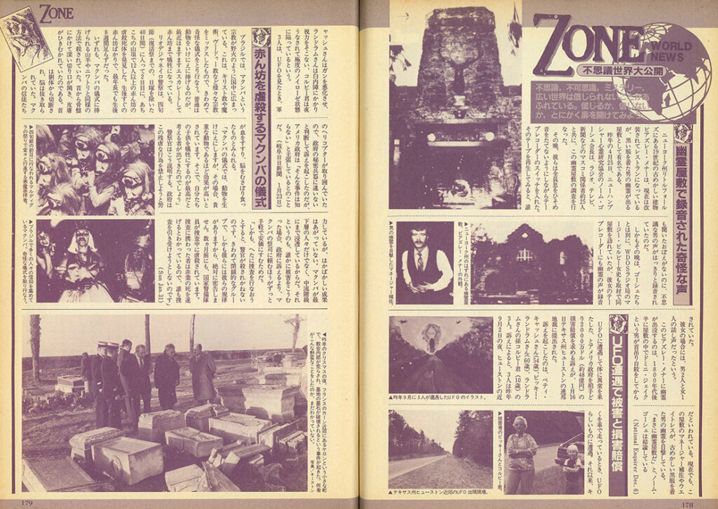 特色1色で13ページ、とにかく不思議・不可思議・スーパーミステリーな小ネタが盛りだくさんな「ZONE WORLD & DOMESTIC NEWS 不思議世界大公開」。ホントに盛りだくさん過ぎるので、「UFO遭遇で被害と損害賠償」という記事だけピックアップしときます。「UFOに遭遇して体に異常を来たした、とアメリカ政府を相手どり2000万ドル(約44億円)の損害賠償を求める訴えが、1月15日テキサス州ヒューストンの連邦地裁に提出された。(改行)訴えを起こしたのは、ベティ・キャッシュさん(54歳)、ビッキー・ランドラムさん(60歳)、ランドラムさんの孫コルビー君(10歳)の3人。訴えによると、3人は昨年 9月2日の夜、ヒューストンの近くを車で走っているとき、UFOらしいものに遭遇。それ以来、キャッシュさんはガンを悪化させ、ランドラムさんは白内障にかかり視力をそこない、コルビー君は夜うなされて極度のノイローゼ状態に陥っているという。(改行)3人は、UFOを見たとき、軍のヘリコプターが取り囲んでいたので、政府の秘密兵器に違いないと判断して訴えを起こしたのだが、アメリカ政府は「そんな事件は知らない」と主張しているとのことだ。(岐阜日日新聞1月23日)」。