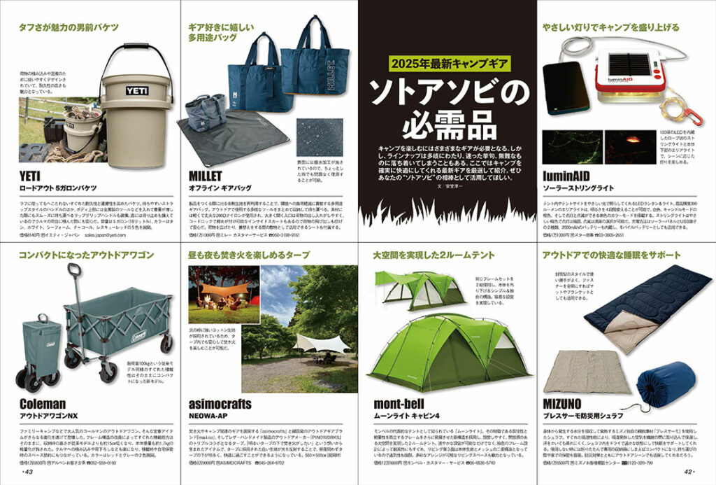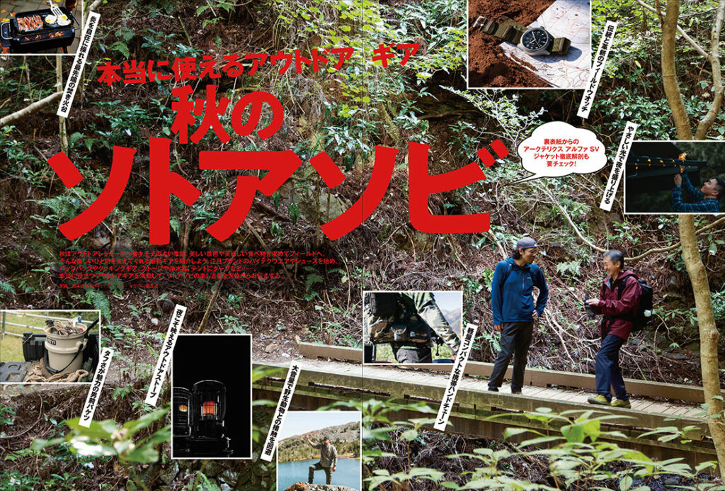 秋はアウトドアレジャーが一番キモチのよい季節。美しい景色や美味しい食べ物を求めてフィールドへ。そんな楽しいひと時を支えてくれる最新ギアを紹介しよう。注目ブランドのハイテクウエアやシューズを始め、バックパックやクッキングギア、ストーブや浄水器、テントにタープなど……。本当に役立つアウトドアギアを満載して、ソトアソビの楽しさを全方位からお伝えする。