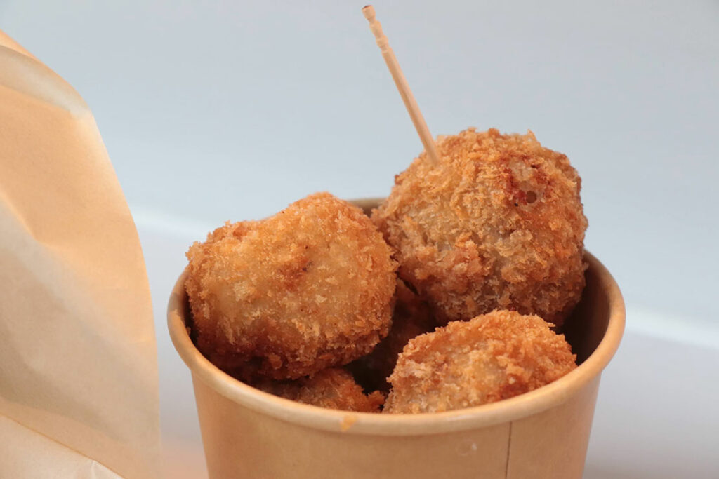 サクサク×ホクホク食感が楽しい、近江牛100%使用の一口サイズコロッケ。衣はサクサク、中はホクホクでジューシー。思わずもう一つ食べたくなる、満足度の高い一品。価格は税込400円。