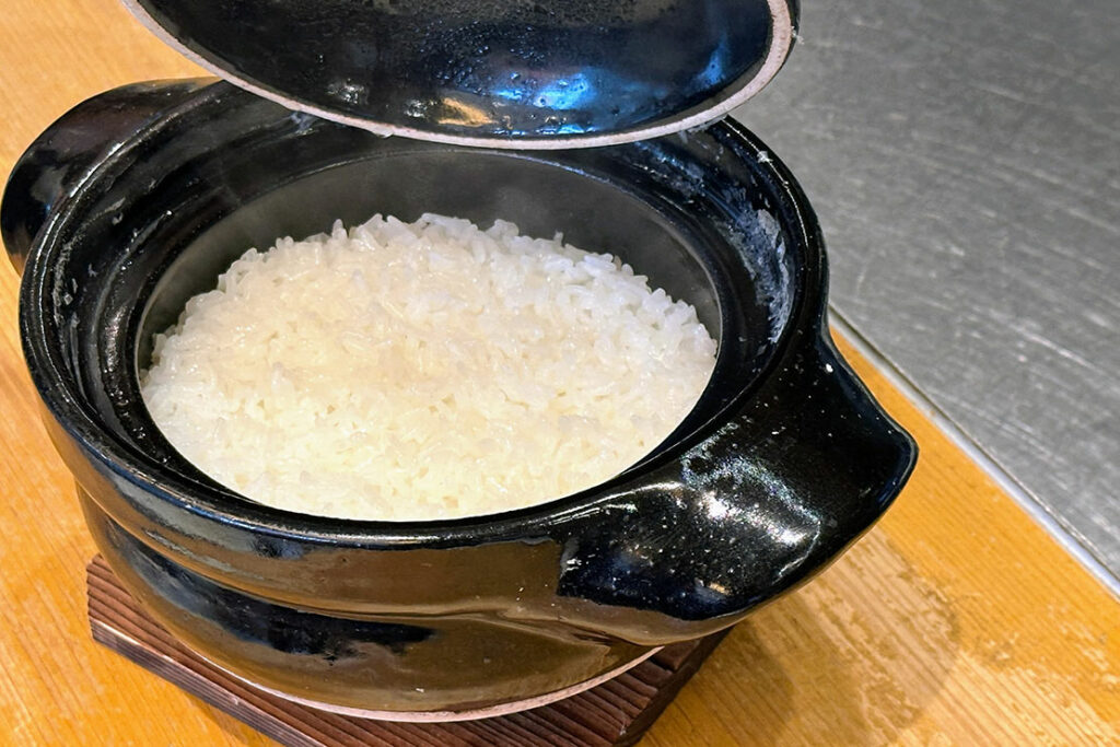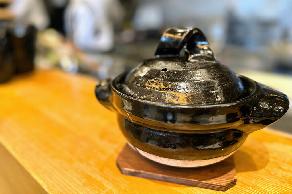 10月の土曜日限定・各日3食のみ(4日・11日・18日・25日)近江牛を贅沢に使用した「もりしま寛閑観(かんかんかん)」の土鍋ごはん。信楽焼の土鍋で、一つひとつ丁寧に「みずかがみ」の新米を炊き上げる。