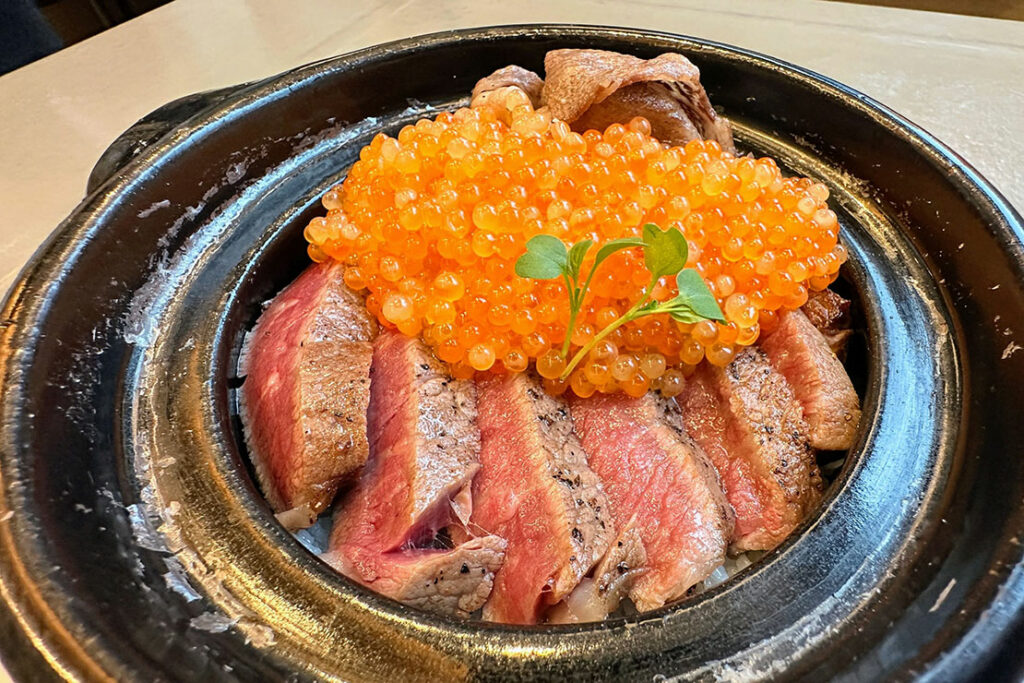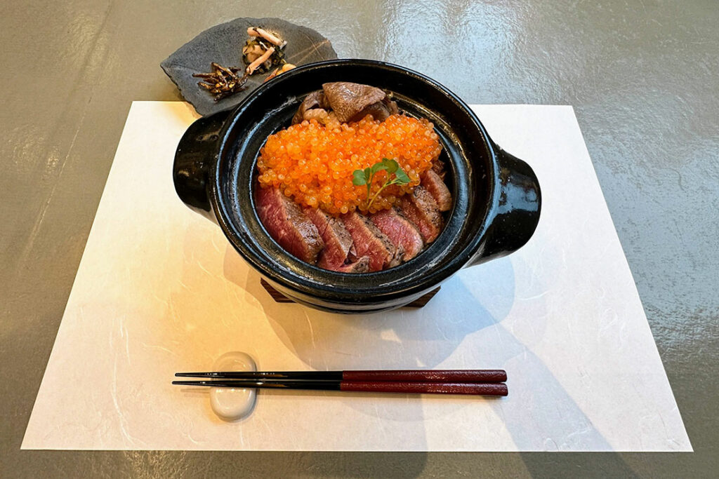 炊き上げたみずかがみに、近江牛(シャトーブリアンステーキとロース焼しゃぶ)と琵琶湖にのみ生息するサケ科の淡水魚「ビワマス」のいくらをふんだんにのせた土鍋。このいくらは、琵琶湖の宝石と言われ滋賀県民でさえなかなか口にすることが出来ない超レアな一品。米の甘み、肉の旨味、ひと粒ひと粒が口の中で弾けるいくらが絶妙に絡み合う美味しさだ。10000円(税込)