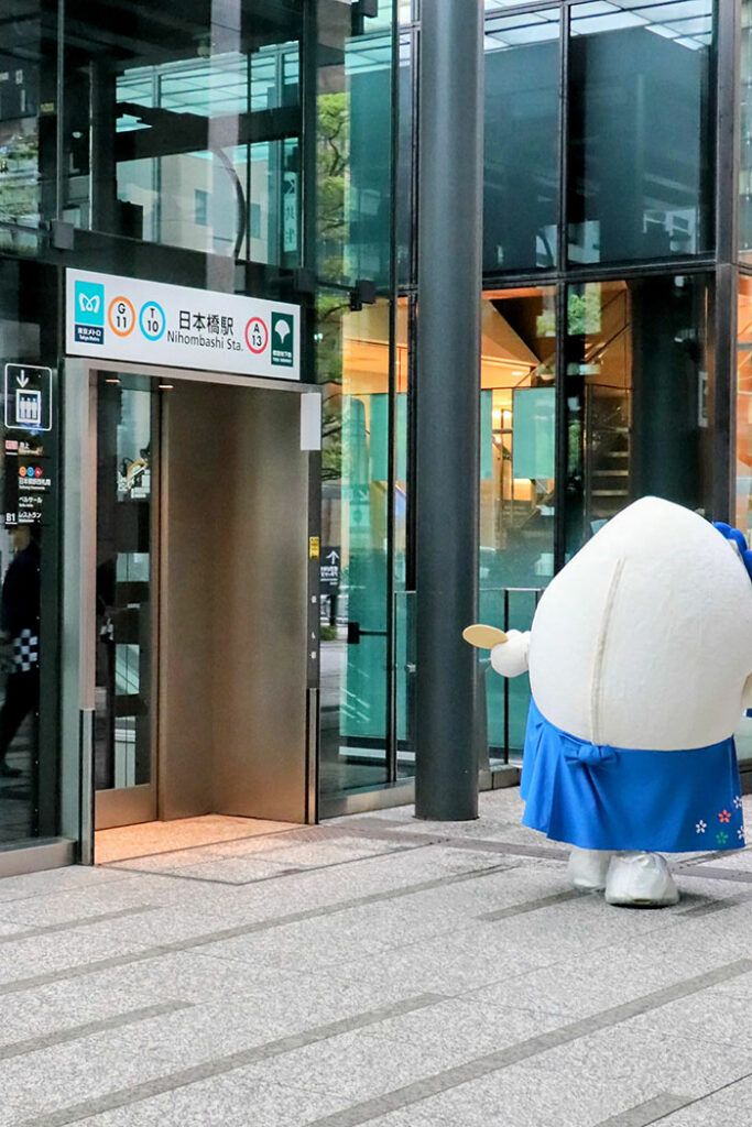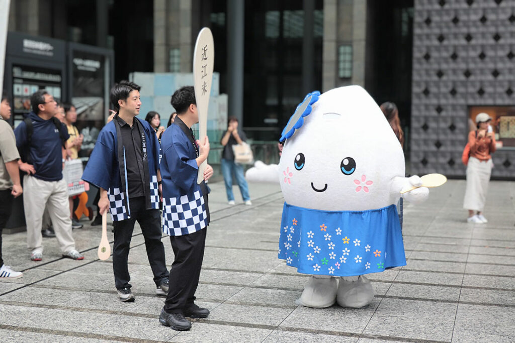 小雨が降る中、「みずかがみん」もスタッフと一緒に、たくさんの人たちに滋賀をPRをしていた。