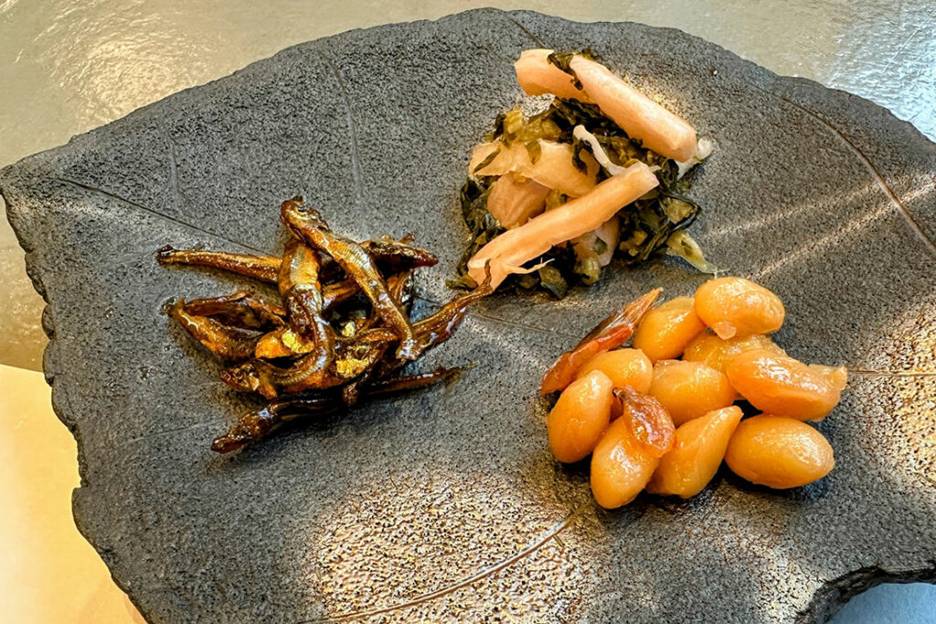 右回りに)日野菜の漬物・えびまめ・湖魚の佃煮。どれもすべて滋賀県産。どれもしっかりと味の主張をしている逸品。