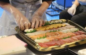 シャリマシンから出てくるシャリにネタを載せ、20貫の寿司を正確に盛り付ける。スピード、美しい盛り付け、そして手順の正確さが求められる。
