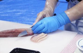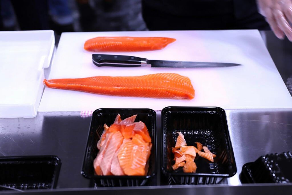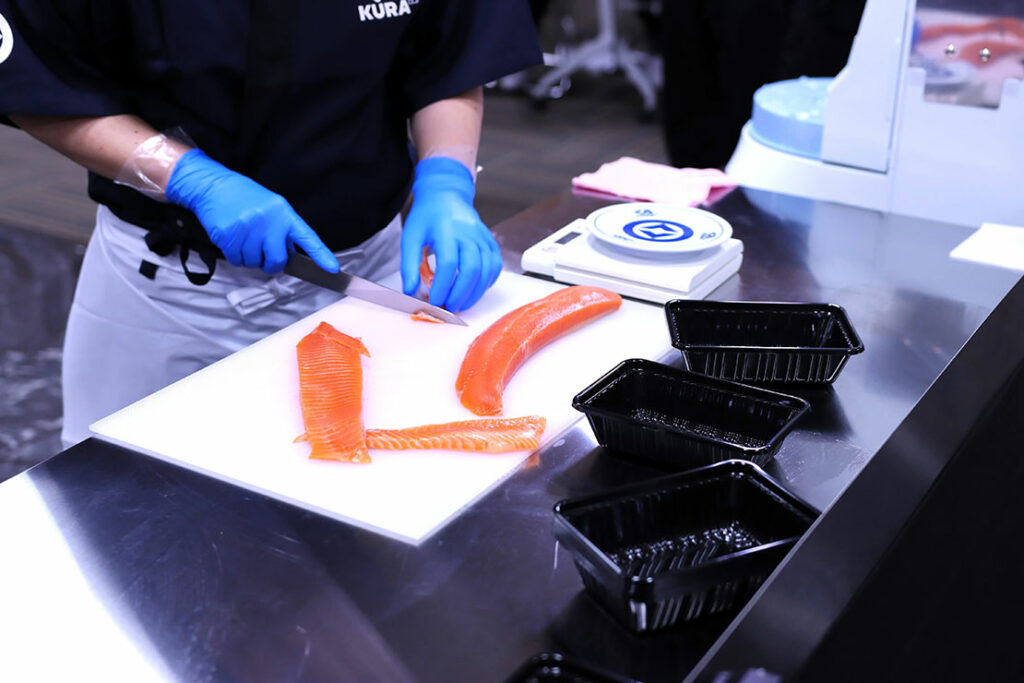 半身のサーモンを、±1gの誤差で30枚にスライスする。切り方の均一性、スピード、衛生管理などの技術を競う競技だ。てっきり、セントラルキッチンであらかじめ切り身にされたものをシャリにのせて客席に出しているのだと思っていた。まさか、ネタを人の手で切っているとは・・・驚いた。