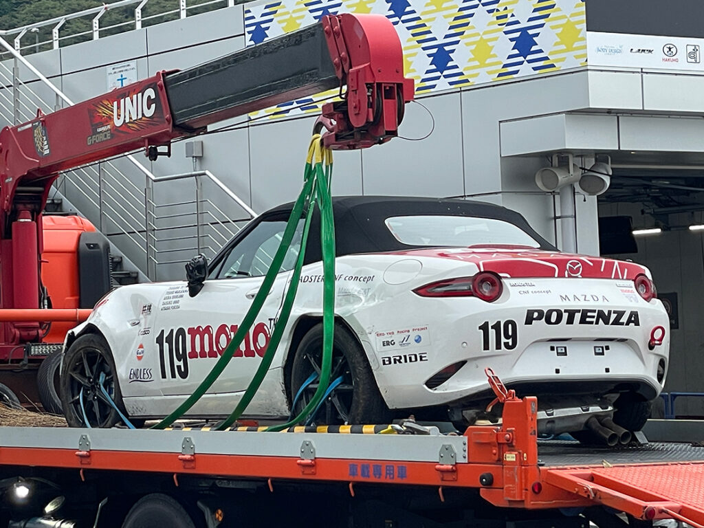 予選終了。モノTVのゼッケン119号車はピットに帰って来ない。「もしや……」という雰囲気の中、福田さんが戻る。とりあえず安堵。そしてクルマは運ばれて来たのだった。