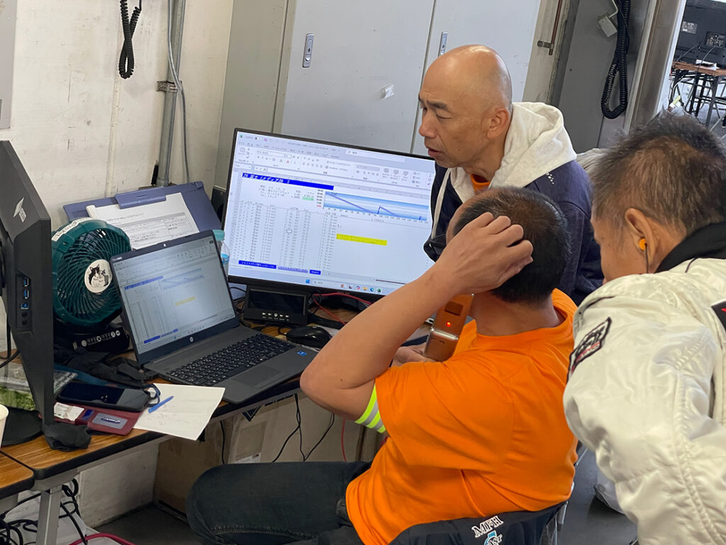 作戦は岐路に。一つはまだ燃料があるので回転制限をもう少し上げてタイムを削っていくパターン。もう一つはもう少し回転を抑えたままにする作戦。残り時間はあと1時間半くらい。悩ましいところで燃料切れの不安もなきにしもあらず。他のチームは若干タイムアップし始めているところも。ここで参謀と軍師殿が出した答えは、前者。「ひとまず●●回転まで回しちゃってください!」と呼びかける谷古宇さん。津川さんは指示通り若干タイムを上げていく。