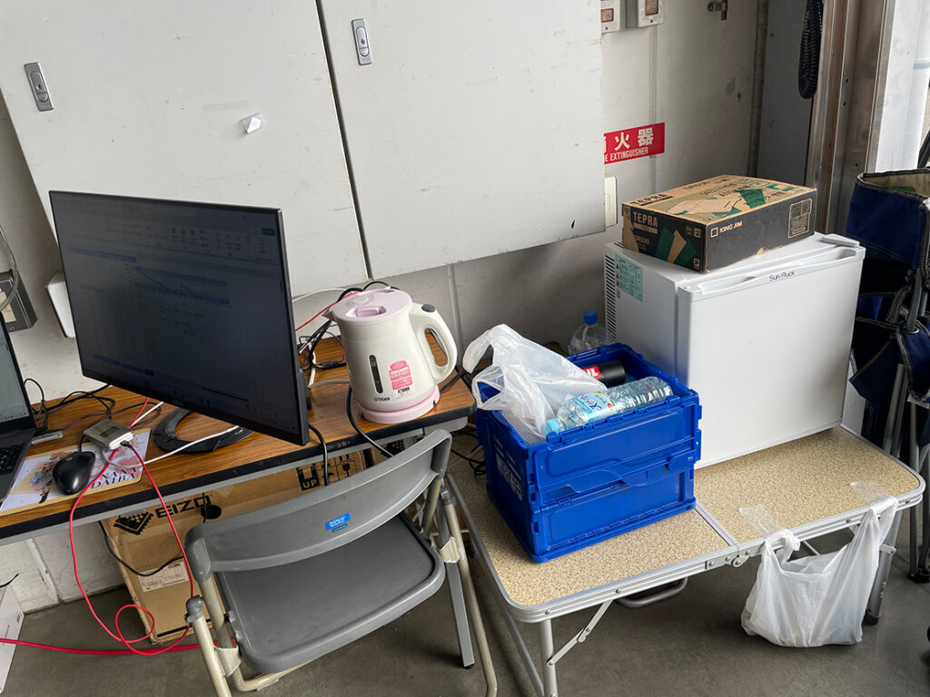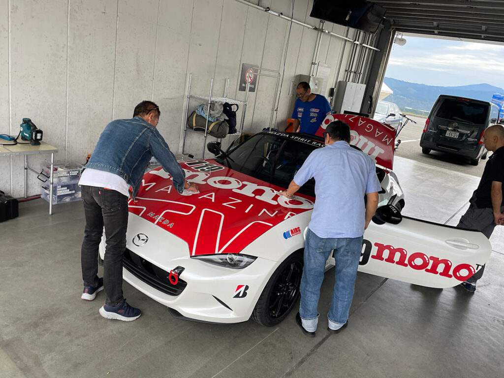 モノTVは昨年より参戦、初挑戦ながらも無事完走している。今年は例年の筑波サーキットから富士スピードウェイに場所が変わっての開催。あてがわれたピットに運ぶ荷物がなかなかの大所帯で、一通りのガレージアイテムはもちろん、PCモニター、ケトルにハンガーかけ、3段ラックから冷蔵庫(!)までと、「これがあると安心ね」の単身赴任パックのよう。その気になれば広大なガレージ付きワンルームの様相を呈するのだ。