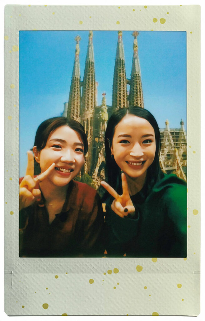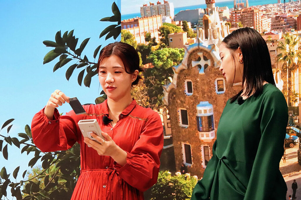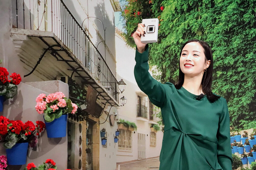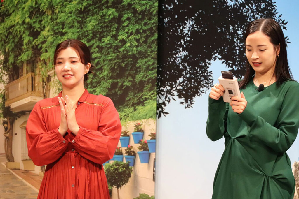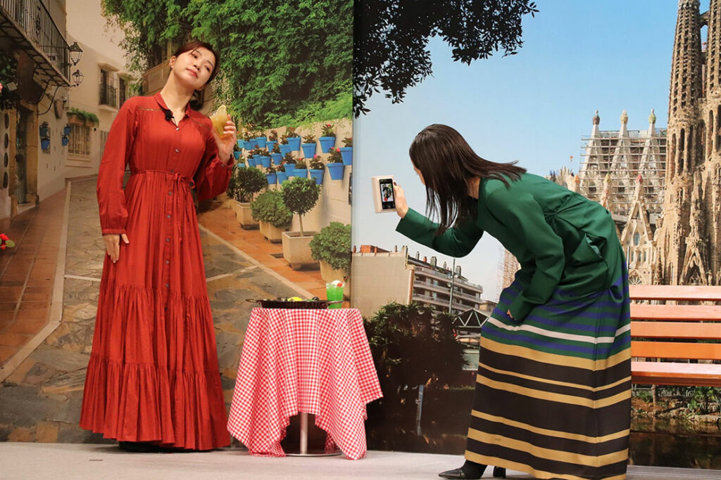 スペインへの旅行を希望する広瀬すずさんと、近日中にスペインを訪れる予定の福田麻貴さんが、スペインの街並みを模したステージセットの前で、「mini LiPlay+」の新機能を活用しながら、互いに写真撮影を行う様子が披露された。