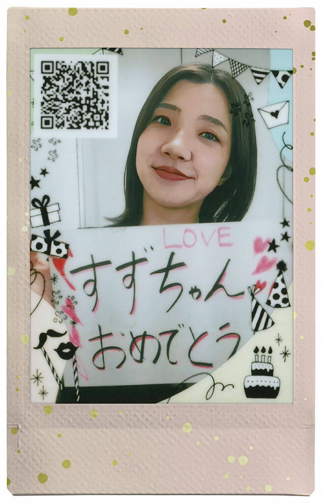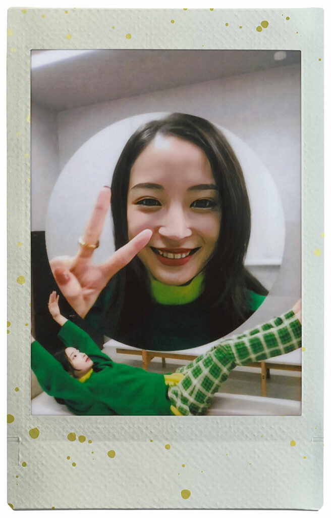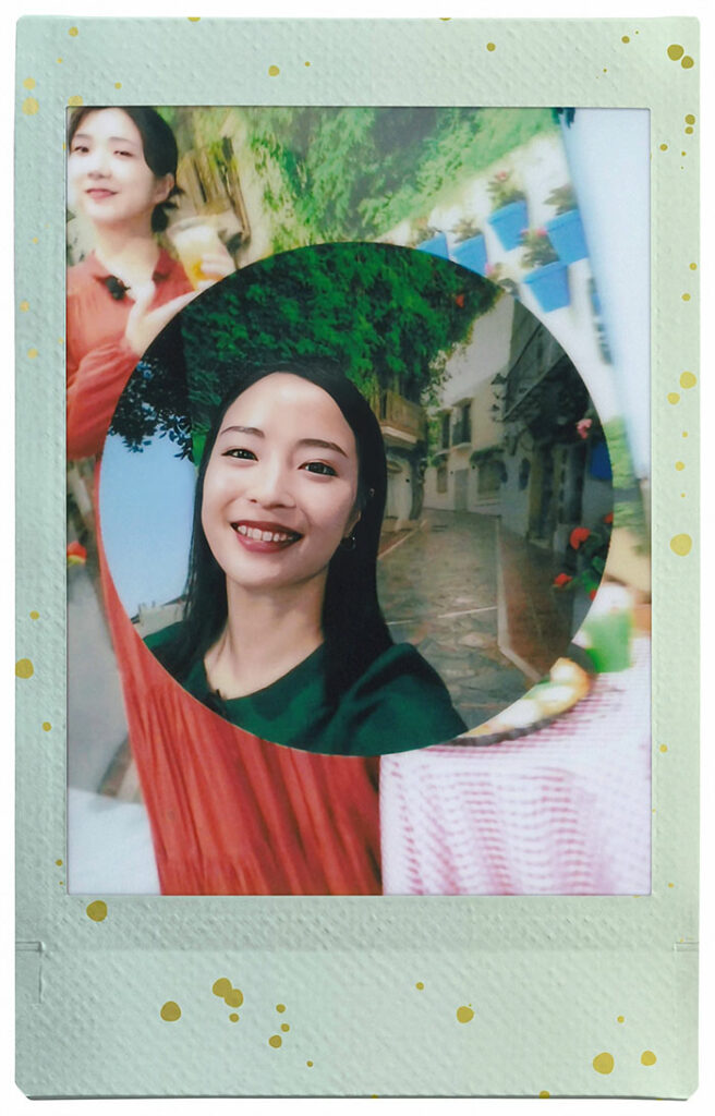 ステージ上では「Layered Photo Mode(レイヤード フォト モード)」で撮影。instax™シリーズ初となるインカメラ(以下、「セルフィーカメラ」)を搭載し、カメラ背面のモニターを確認しながらセルフィーカメラで撮影した自撮り画像を、メインカメラで撮影した風景画像に重ねてプリント。
