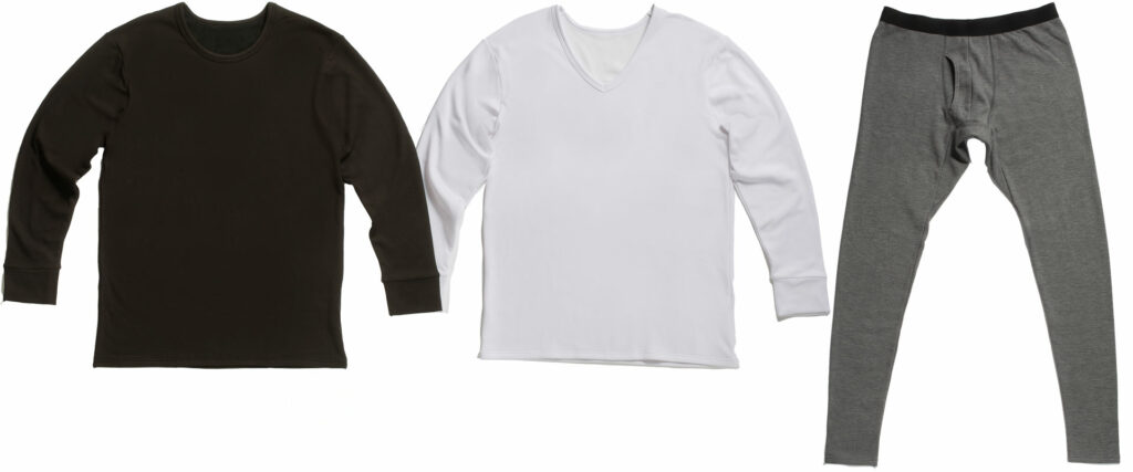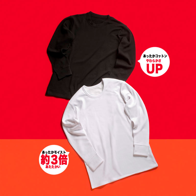 インナーはバリエーション豊富。あったかモイストの長袖Tシャツは丸首、V首ともにカラーは黒と白。タイツは黒とグレー。あったかコットンの長袖Tシャツは丸首のカラーは黒と紺、V首は黒と白。タイツは黒と紺。サイズはそれぞれM/L/LLが揃う。