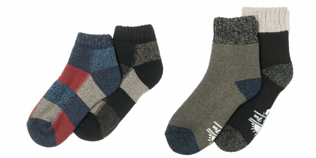 (右)裏起毛パイルのルームソックスは、フローリングでも滑りにくいように、足底に滑り止め付きもあり。