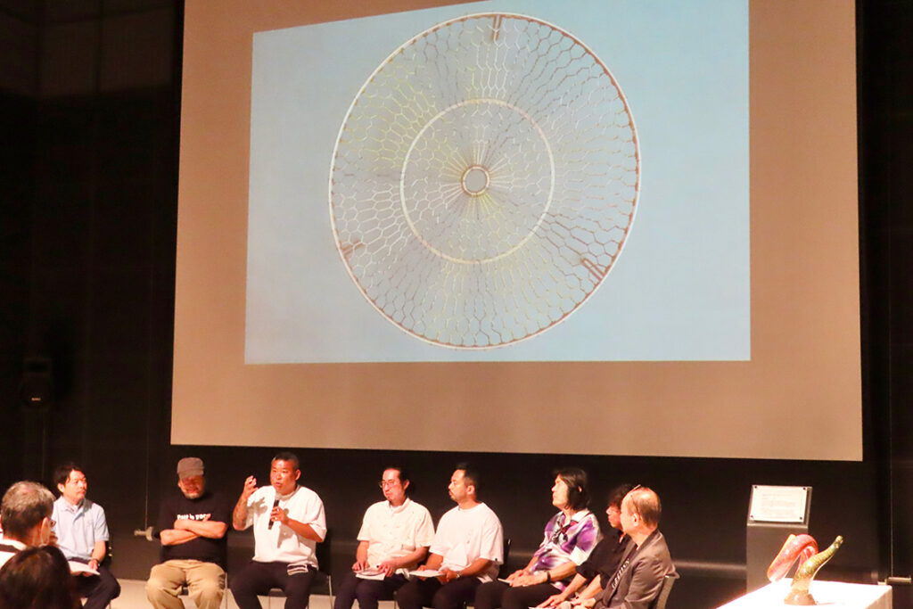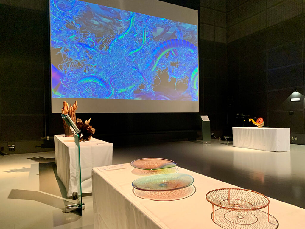 さらに、沖縄県読谷村にある工房宙吹ガラス工房「虹」を経営する、琉球ガラス作家の稲嶺盛一郎氏は、脳の神経活動を琉球リサイクルガラス、土紋技術で表現したプレートを展示。
