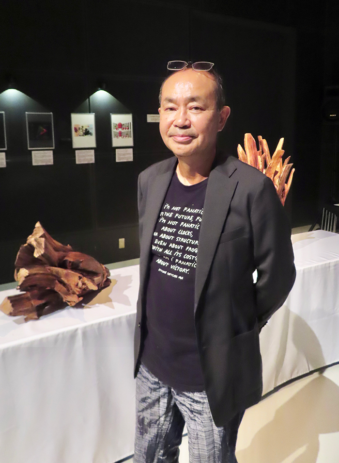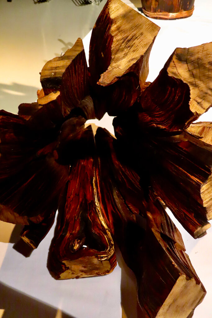 木工の匠として知られる「中川木工芸」の「比良工房」を主宰する木桶職人の中川周士氏は、脳内の神経細胞の軸索走行を木工、桶の技術で表現したアート作品を展示した。