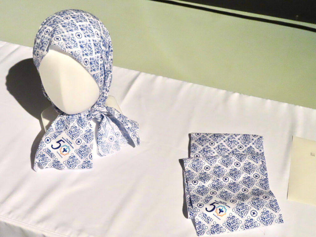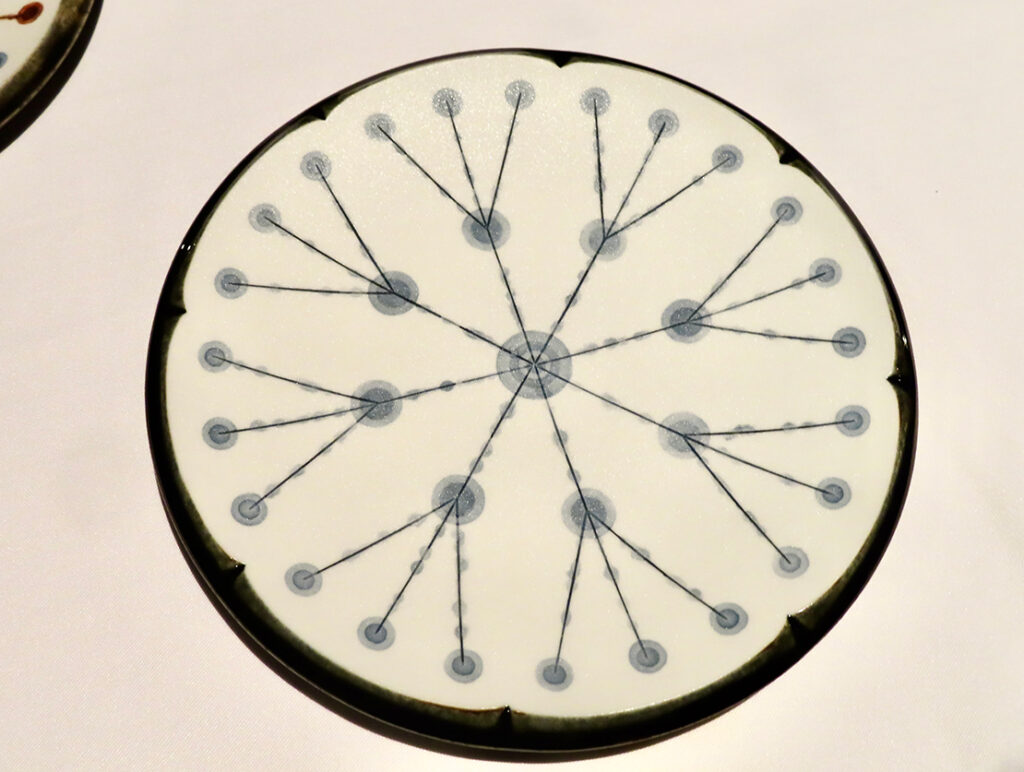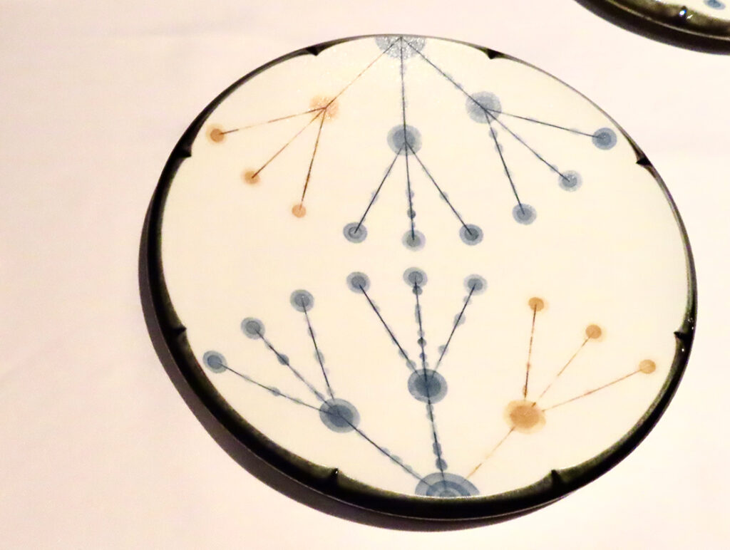 陶芸作家の大原功樹氏は、不織布をモチーフの形に切りそこに顔料を染み込ませて絵付けをする「布染」の技法を活用。神経細胞間の情報伝達を陶芸の布染技術で表現したプレートを作成し、細かな模様を美しく表現した。